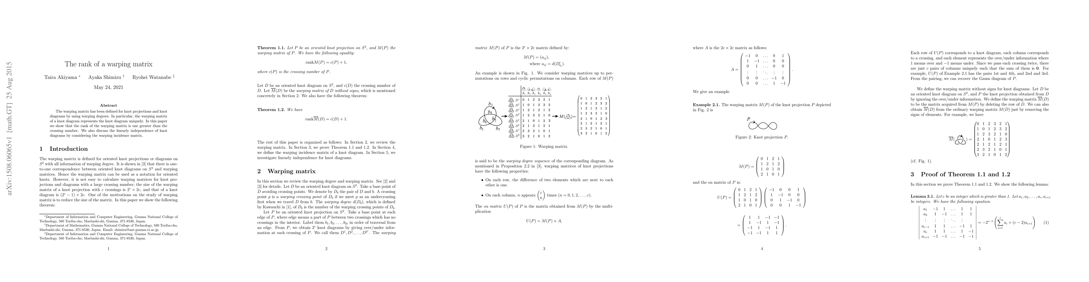 Summary: This paper explores the rank of the warping matrix for knot diagrams, demonstrating that its rank is one greater than the crossing number. It also examines the linear independence of knot diagrams through the warping incidence matrix.
