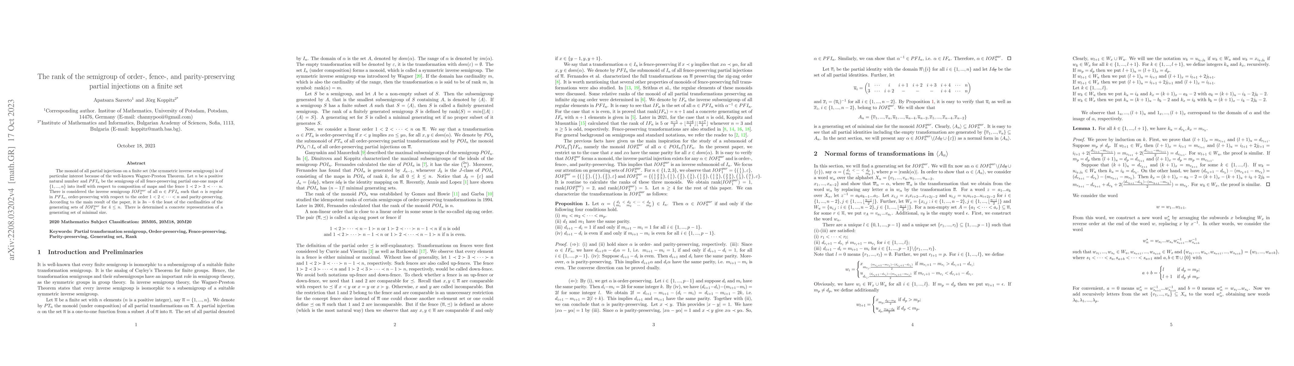 The monoid of all partial injections on a finite set (the symmetric inverse semigroup) is of particular interest because of the well-known Wagner-Preston Theorem. In this article, we step forward the study of a submonoid of the symmetric inverse semigroup. We explore the monoid of all order-, fence-, and parity-preserving transformations on an $n$-element chain. We also characterize the transformations in that monoid and show that it has a rank $3n-6$. In particular, we provide a generating set $A_n$ of minimal size and exhibit concrete normal forms for the transformations generated by $A_n$.