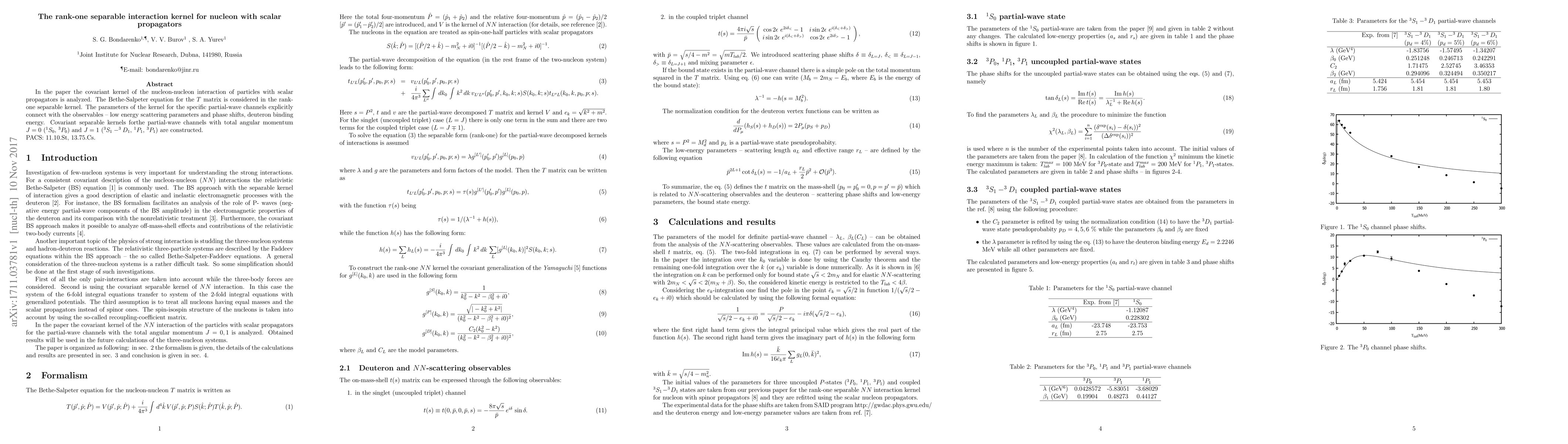 In the paper the covariant kernel of the nucleon-nucleon interaction of particles with scalar propagators is analyzed. The Bethe-Salpeter equation for the T matrix is considered in the rank- one separable kernel. The parameters of the kernel for the specific partial-wave channels explicitly connect with the observables { low energy scattering parameters and phase shifts, deuteron binding energy. Covariant separable kernels forthe partial-wave channels with total angular momentum J = 0 (1S0, 3P0) and J = 1 (3S1 -3D1, 1P1, 3P1) are constructed.