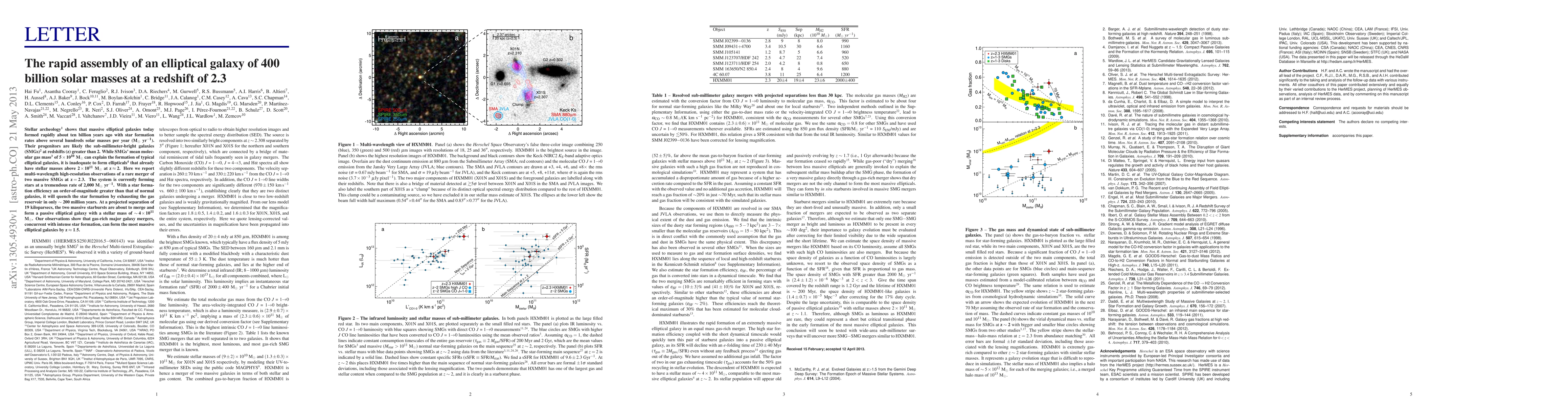 Stellar archeology shows that massive elliptical galaxies today formed rapidly about ten billion years ago with star formation rates above several hundreds solar masses per year (M_sun/yr). Their progenitors are likely the sub-millimeter-bright galaxies (SMGs) at redshifts (z) greater than 2. While SMGs' mean molecular gas mass of 5x10^10 M_sun can explain the formation of typical elliptical galaxies, it is inadequate to form ellipticals that already have stellar masses above 2x10^11 M_sun at z ~ 2. Here we report multi-wavelength high-resolution observations of a rare merger of two massive SMGs at z = 2.3. The system is currently forming stars at a tremendous rate of 2,000 M_sun/yr. With a star formation efficiency an order-of-magnitude greater than that of normal galaxies, it will quench the star formation by exhausting the gas reservoir in only ~200 million years. At a projected separation of 19 kiloparsecs, the two massive starbursts are about to merge and form a passive elliptical galaxy with a stellar mass of ~4x10^11 M_sun. Our observations show that gas-rich major galaxy mergers, concurrent with intense star formation, can form the most massive elliptical galaxies by z ~ 1.5.