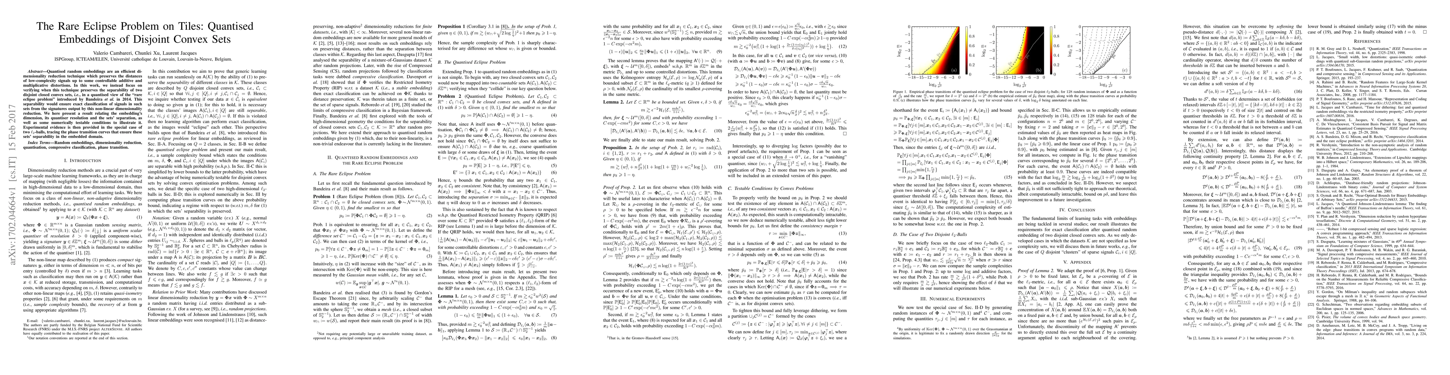 Quantised random embeddings are an efficient dimensionality reduction technique which preserves the distances of low-complexity signals up to some controllable additive and multiplicative distortions. In this work, we instead focus on verifying when this technique preserves the separability of two disjoint closed convex sets, i.e., in a quantised view of the "rare eclipse problem" introduced by Bandeira et al. in 2014. This separability would ensure exact classification of signals in such sets from the signatures output by this non-linear dimensionality reduction. We here present a result relating the embedding's dimension, its quantiser resolution and the sets' separation, as well as some numerically testable conditions to illustrate it. Experimental evidence is then provided in the special case of two $\ell_2$-balls, tracing the phase transition curves that ensure these sets' separability in the embedded domain.