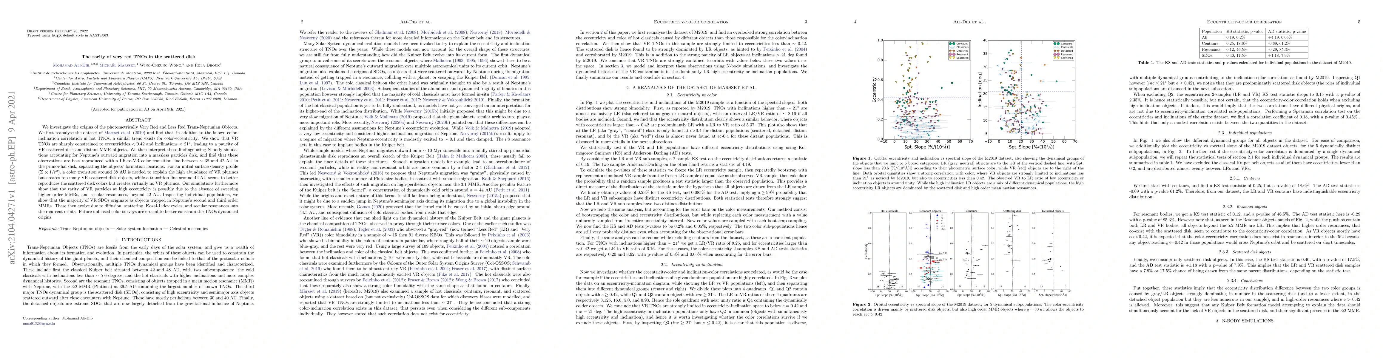 A study finds that very red trans-Neptunian objects in the scattered disk have unique characteristics, including limited eccentricity and inclination ranges, which suggests they formed at specific distances from Neptune's orbit.