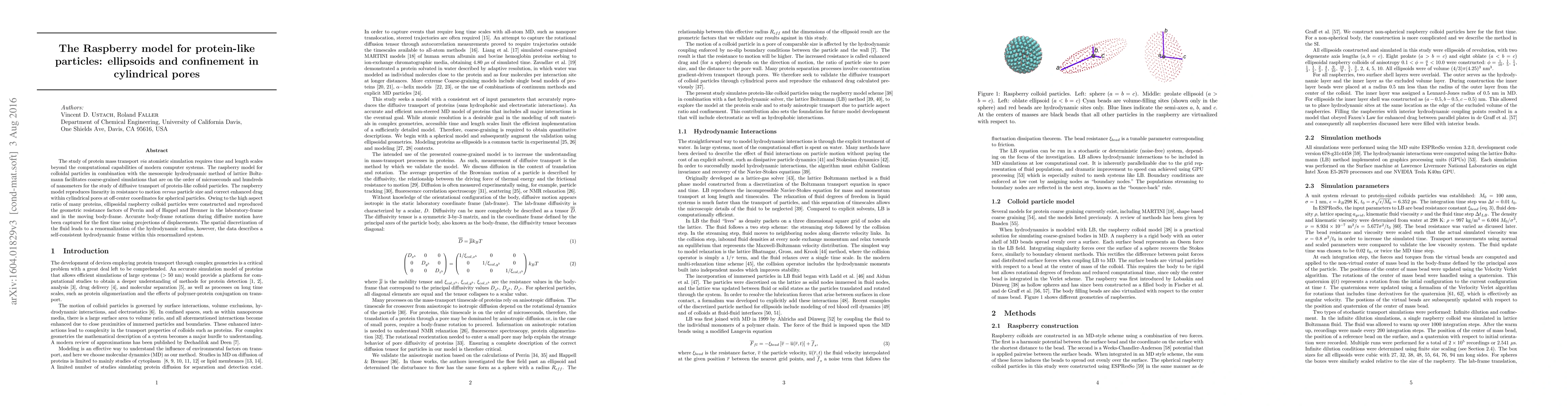 This paper introduces the raspberry model for ellipsoidal protein-like particles, combining it with lattice Boltzmann methods for mesoscopic simulations. The model accurately captures the enhanced drag and rotational dynamics of ellipsoids in cylindrical pores, providing insights into protein transport at microsecond and nanometer scales.