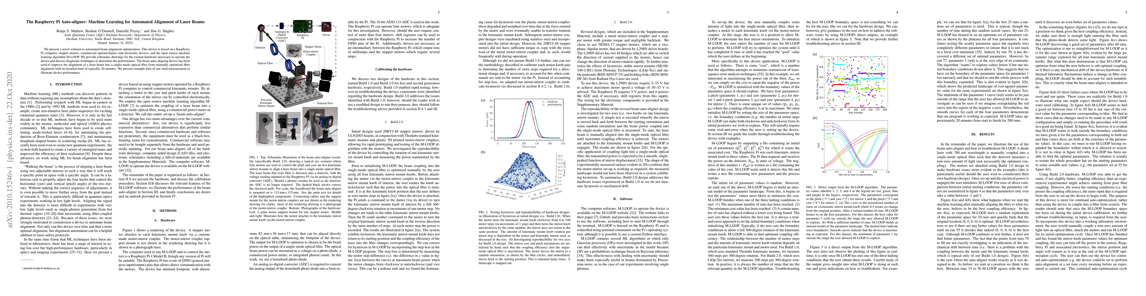 The Raspberry Pi Auto-aligner employs machine learning and open-source algorithms to automate laser beam alignment, significantly reducing alignment time from 20 minutes to a fraction of that, showcasing improved performance through custom hardware and diagnostic techniques.