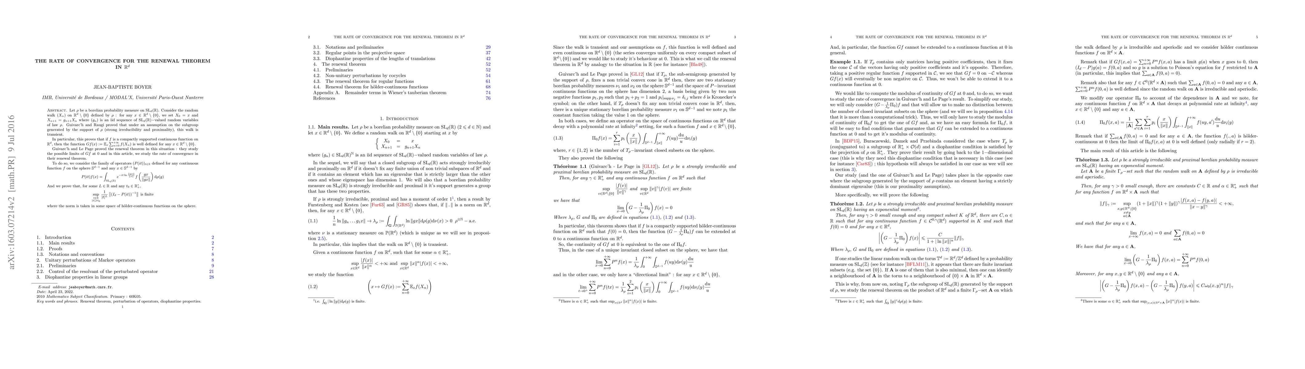 This paper investigates the rate of convergence for the renewal theorem in a random walk on $\mathbb{R}^d$ driven by an iid sequence of $\mathrm{SL}_d(\mathbb{R})$-valued random variables with a Borelian probability measure $\rho$. It proves that the supremum of a certain norm involving the inverse of an operator defined via the random walk is finite, establishing the rate of convergence in the renewal theorem.