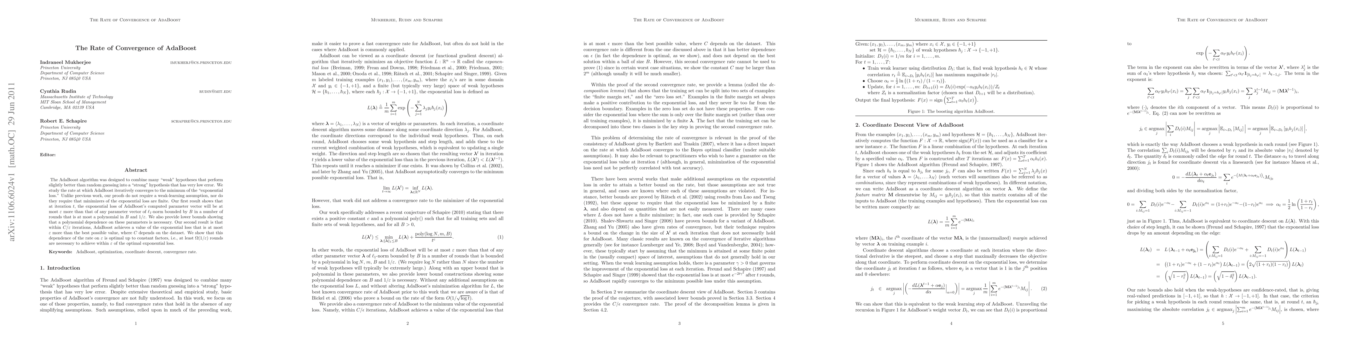 The AdaBoost algorithm was designed to combine many "weak" hypotheses that perform slightly better than random guessing into a "strong" hypothesis that has very low error. We study the rate at which AdaBoost iteratively converges to the minimum of the "exponential loss." Unlike previous work, our proofs do not require a weak-learning assumption, nor do they require that minimizers of the exponential loss are finite. Our first result shows that at iteration $t$, the exponential loss of AdaBoost's computed parameter vector will be at most $\epsilon$ more than that of any parameter vector of $\ell_1$-norm bounded by $B$ in a number of rounds that is at most a polynomial in $B$ and $1/\epsilon$. We also provide lower bounds showing that a polynomial dependence on these parameters is necessary. Our second result is that within $C/\epsilon$ iterations, AdaBoost achieves a value of the exponential loss that is at most $\epsilon$ more than the best possible value, where $C$ depends on the dataset. We show that this dependence of the rate on $\epsilon$ is optimal up to constant factors, i.e., at least $\Omega(1/\epsilon)$ rounds are necessary to achieve within $\epsilon$ of the optimal exponential loss.