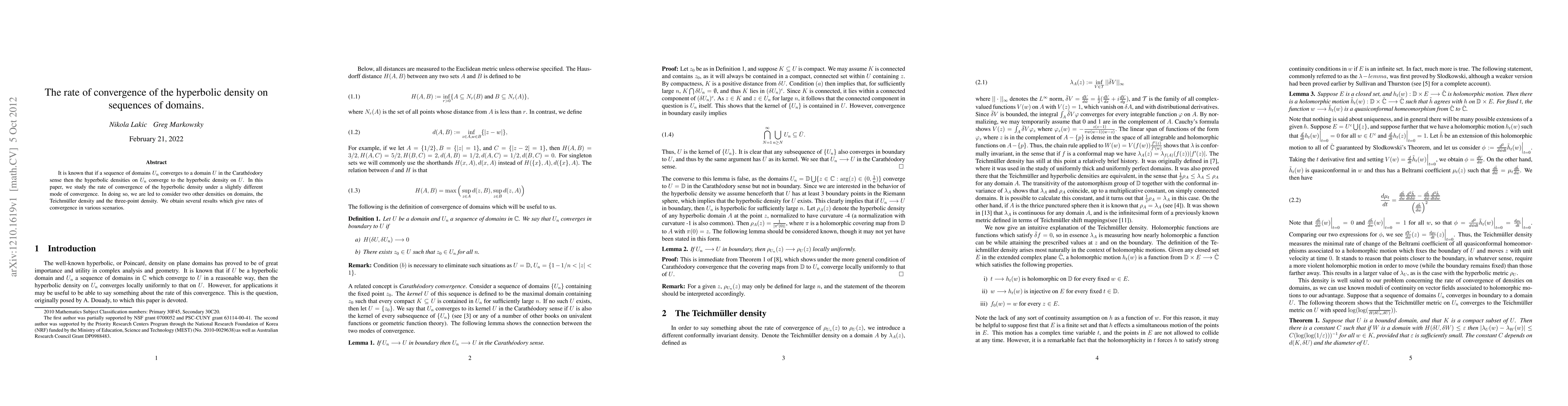 It is known that if a sequence of domains $U_n$ converges to a domain $U$ in the Caratheodory sense then the hyperbolic densities on $U_n$ converge to the hyperbolic density on $U$. In this paper, we study the rate of convergence of the hyperbolic density under a slightly different mode of convergence. In doing so, we are led to consider two other densities on domains, the Teichmueller density and the three-point density. We obtain several results which give rates of convergence in various scenarios.