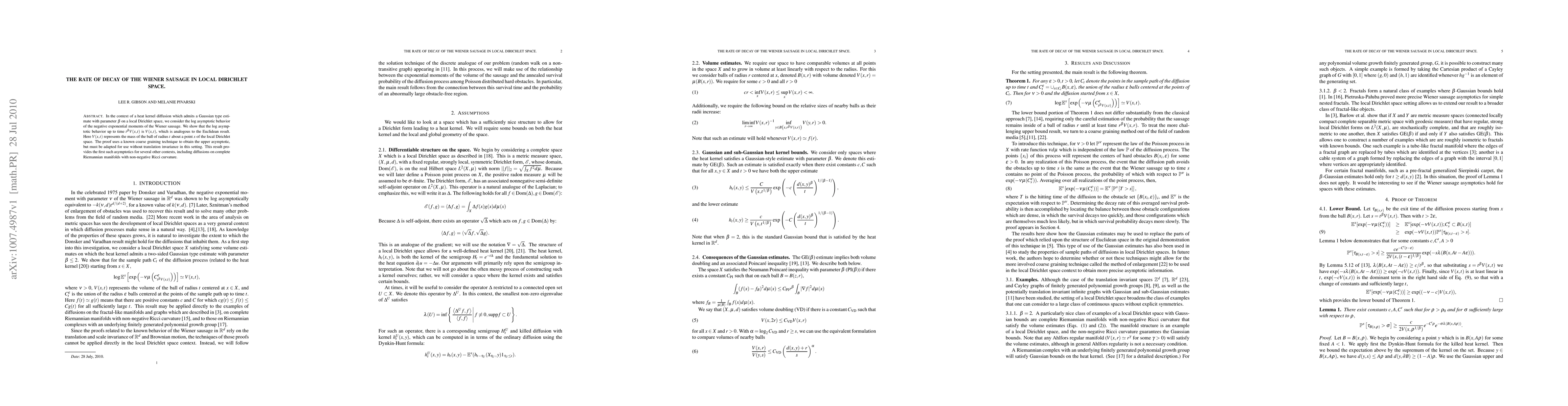 This paper investigates the decay rate of the Wiener sausage in a local Dirichlet space, showing that the log asymptotic behavior of its negative exponential moments up to time \( t^{\beta}V(x,t) \) matches \( V(x,t) \), analogous to the Euclidean case. The proof adapts a coarse graining technique to account for the lack of translation invariance in this setting.