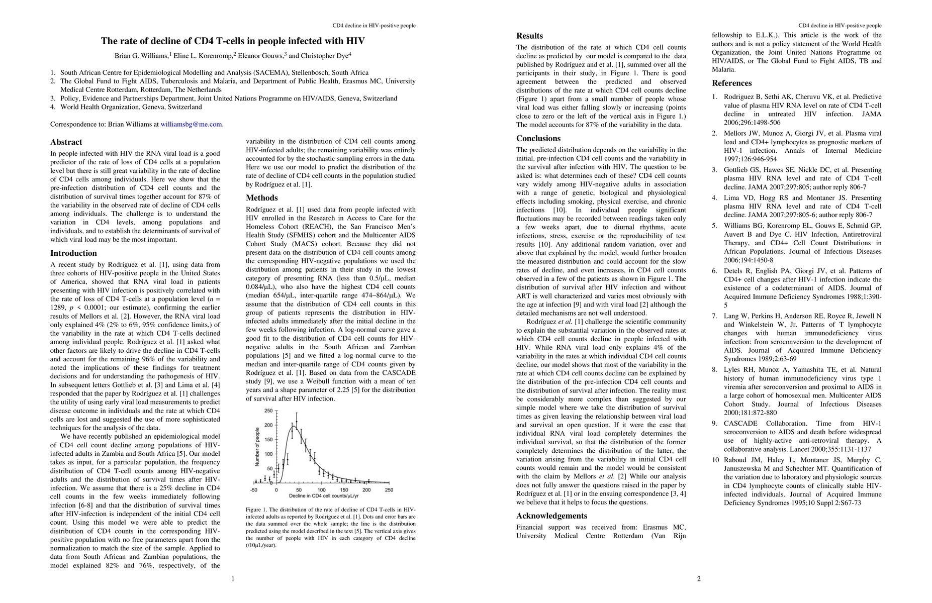 In people infected with HIV the RNA viral load is a good predictor of the rate of loss of CD4 cells at a population level but there is still great variability in the rate of decline of CD4 cells among individuals. Here we show that the pre-infection distribution of CD4 cell counts and the distribution of survival times together account for 87% of the variability in the observed rate of decline of CD4 cells among individuals. The challenge is to understand the variation in CD4 levels, among populations and individuals, and to establish the determinants of survival of which viral load may be the most important.