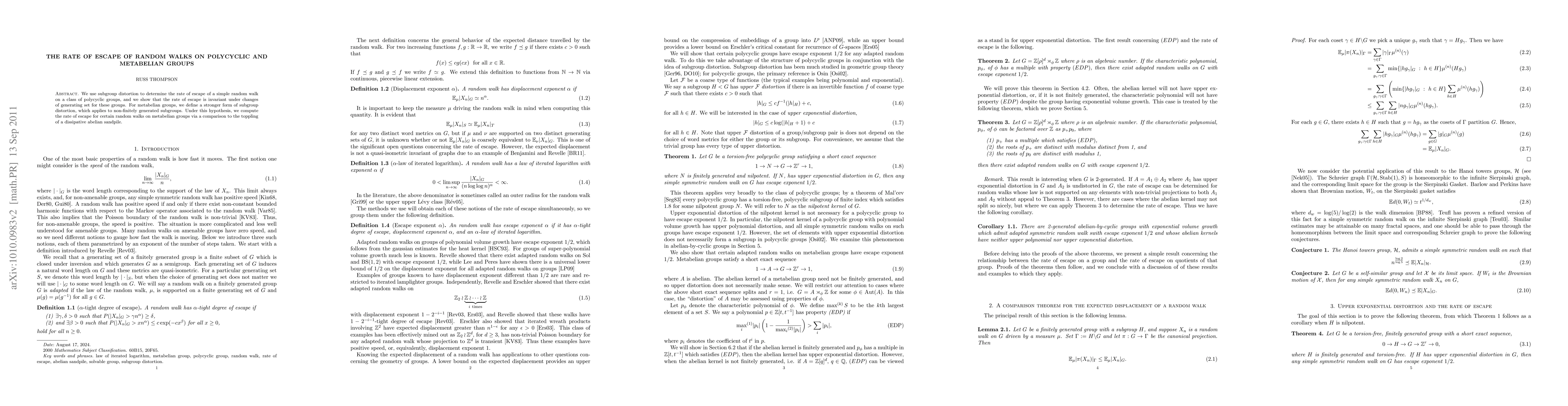 Summary: This paper determines the escape rate for simple random walks on polycyclic groups using subgroup distortion, demonstrating invariance under generating set changes. For metabelian groups, it introduces a stronger distortion concept for non-finitely generated subgroups and calculates the escape rate by comparing random walks to a dissipative abelian sandpile model.