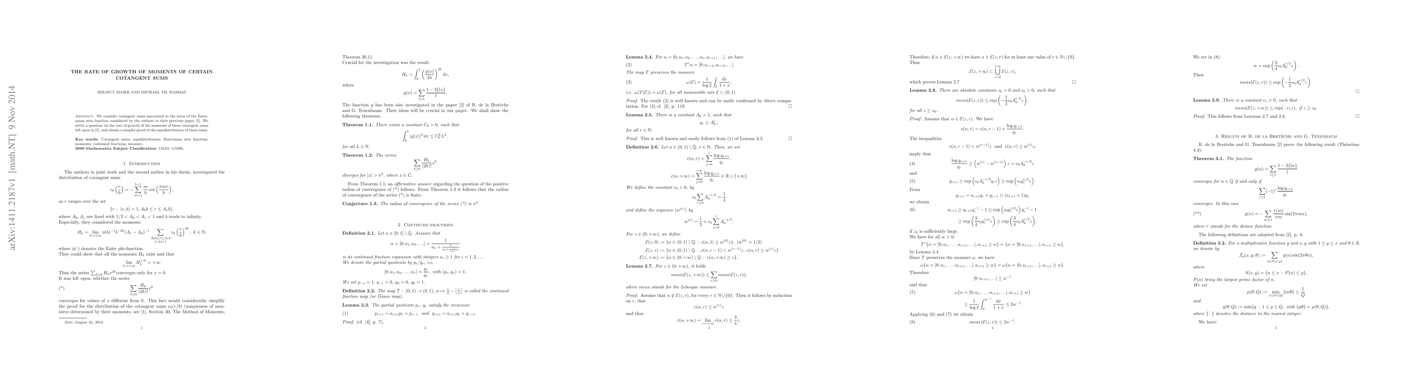 This paper addresses the growth rate of moments of cotangent sums linked to the zeros of the Estermann zeta function, resolving a previously unanswered question and providing a more straightforward proof of their equidistribution.