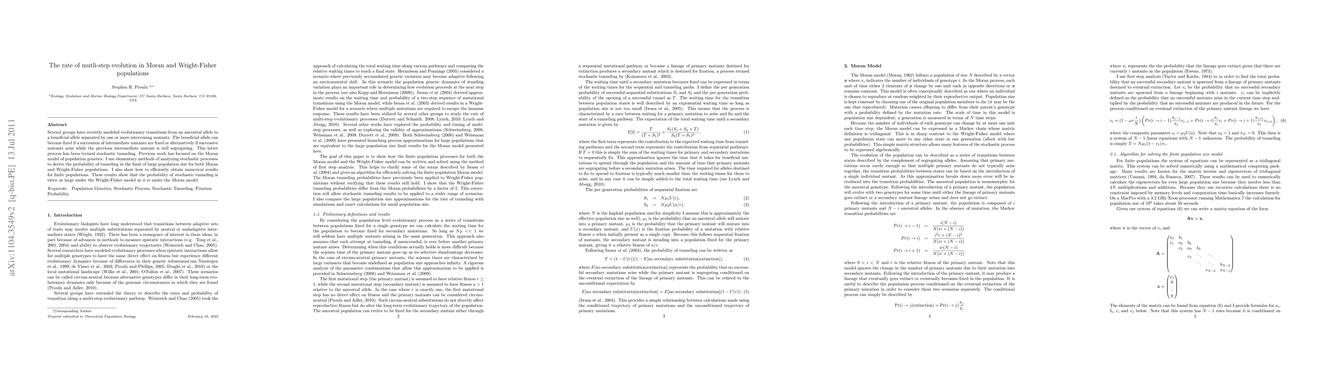 Several groups have recently modeled evolutionary transitions from an ancestral allele to a beneficial allele separated by one or more intervening mutants. The beneficial allele can become fixed if a succession of intermediate mutants are fixed or alternatively if successive mutants arise while the previous intermediate mutant is still segregating. This latter process has been termed stochastic tunneling. Previous work has focused on the Moran model of population genetics. I use elementary methods of analyzing stochastic processes to derive the probability of tunneling in the limit of large population size for both Moran and Wright-Fisher populations. I also show how to efficiently obtain numerical results for finite populations. These results show that the probability of stochastic tunneling is twice as large under the Wright-Fisher model as it is under the Moran model.