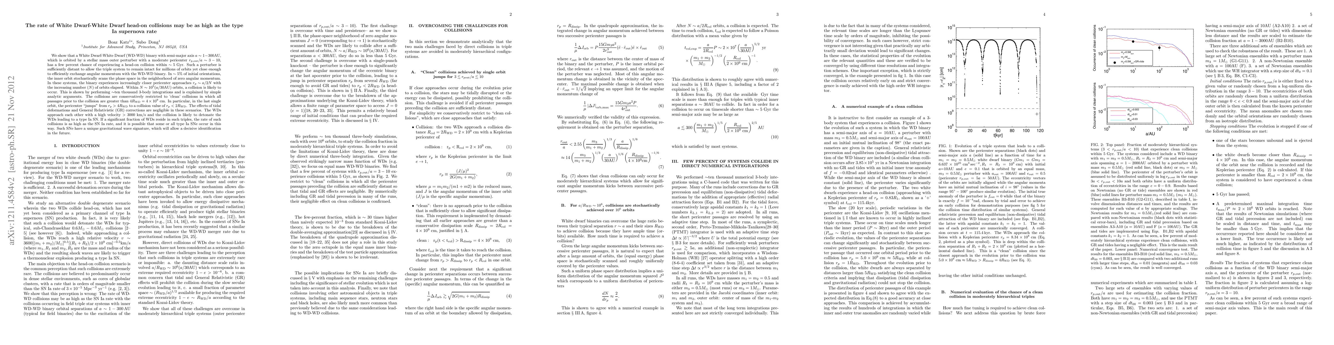 We show that a White Dwarf-White Dwarf (WD-WD) binary with semi-major axis a=1-300 AU, which is orbited by a stellar mass outer perturber with a moderate pericenter r_{p, out} \sim 3-10 x a, has a few percent chance of experiencing a head-on collision within ~5 Gyr. Such a perturber is sufficiently distant to allow the triple system to remain intact for millions of orbits while efficiently exchanging angular momentum with the WD-WD binary. In ~ 5% of the initial orientations, the inner orbit efficiently scans the (equal energy) phase space in the region of zero angular momentum. In these systems, the binary experiences increasingly closer, stochastic, pericenter approaches r_p ~ a/2N with the increasing number (N) of orbits elapsed. Within N~10^5(a/30AU) orbits, a collision is likely to occur. This is shown by performing \simten thousand 3-body integrations and is explained by simple analytic arguments. The collisions are conservatively restricted to "clean" collisions in which all passages prior to the collision are greater than 4R_WD=4x10^9cm. In particular, within the last single orbit, the pericenter changes from r_p>4R_WD to a collision value of r_p<2R_WD. The effects of tidal deformations and General Relativistic (GR) corrections are negligible in these scenarios. The WDs approach each other with a high velocity >3000 km/s and the collision is likely to detonate the WDs leading to a type Ia SNe. If a significant fraction of WDs reside in such triples, the rate of such collisions is as high as the SNe Ia rate, and it is possible that some or all type Ia SNe occur in this way. Such SNe have a unique gravitational wave signature, which will allow a decisive identification in the future.