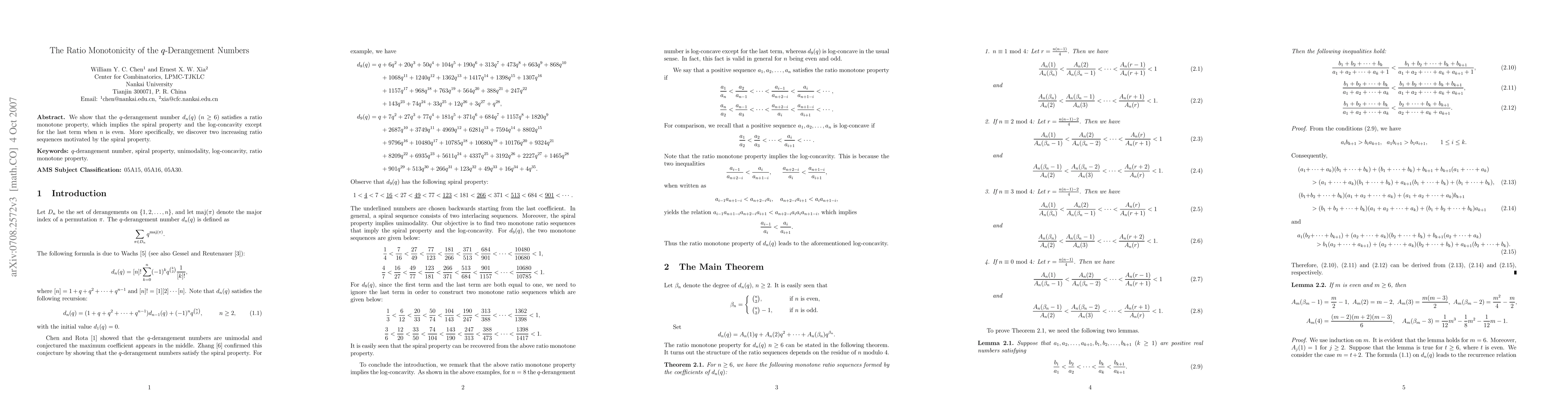 We show that the $q$-derangement numbers satisfy a ratio monotone property, which is analogous to the log-concavity and is stronger than the spiral property and the unimodality.