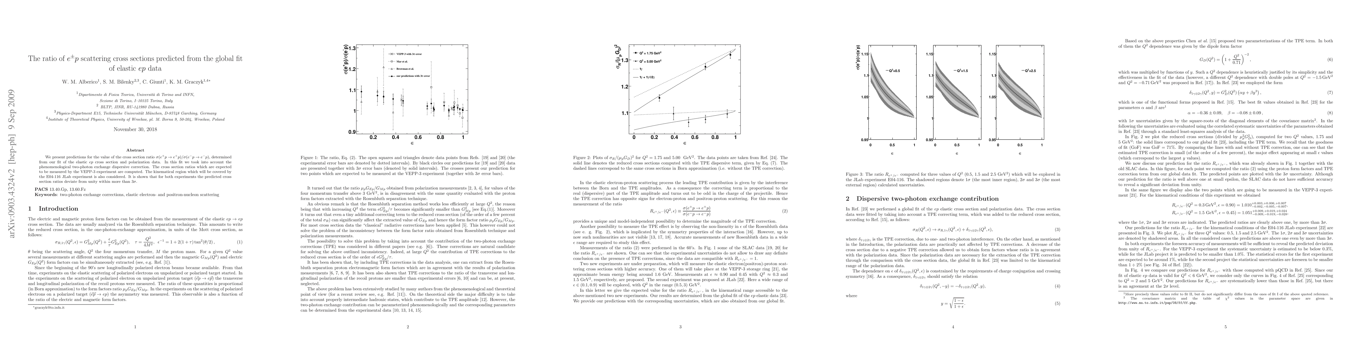 This paper predicts the ratio of $e^{\pm}p$ scattering cross sections using a global fit of elastic $ep$ data, including a two-photon exchange correction. The predicted cross section ratios are expected to deviate significantly from unity, with implications for the VEPP-3 and E04-116 JLab experiments.