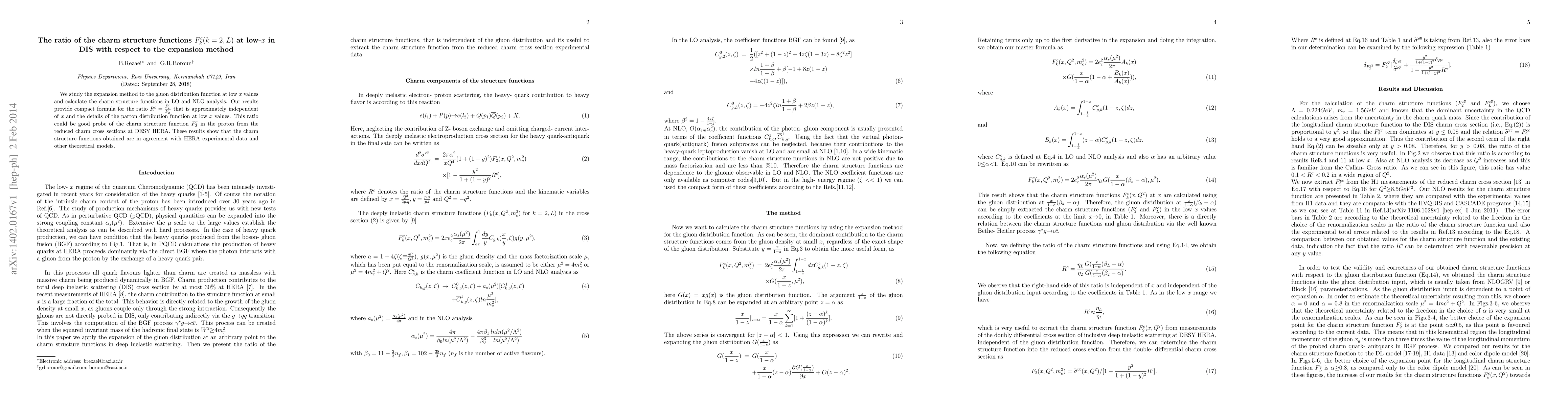 We study the expansion method for the gluon distribution function at low x values and calculate the charm structure functions in the LO and NLO analysis. Our results provide a compact formula for the ratio $R^{c} =F^{c}_{L}/F^{c}_{2}$, which is approximately independent of x and the details of the parton distribution function at low x values. This ratio could be a good probe of the charm structure function $F^{c}_{2}$ in the proton deduced from the reduced charm cross sections at DESY HERA. These results show that the charm structure functions obtained are in agreement with HERA experimental data and other theoretical models.
