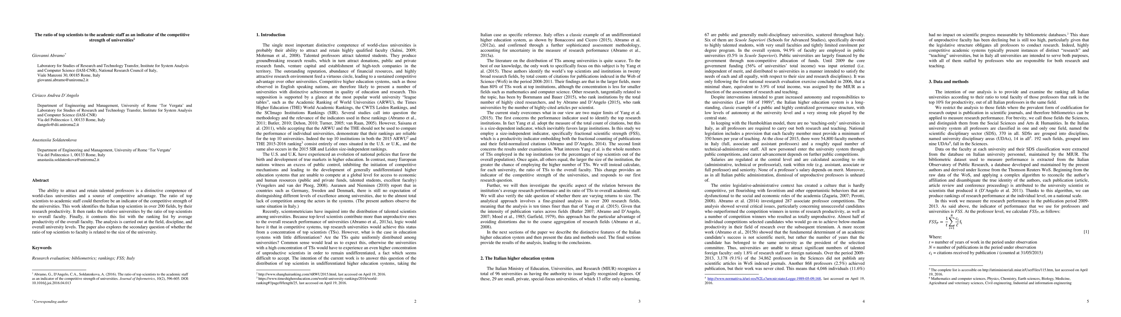 This paper investigates the ratio of top scientists to academic staff as an indicator of university competitive strength, identifying and ranking Italian universities based on this ratio across various fields and disciplines. It also examines the correlation between this ratio and university size.