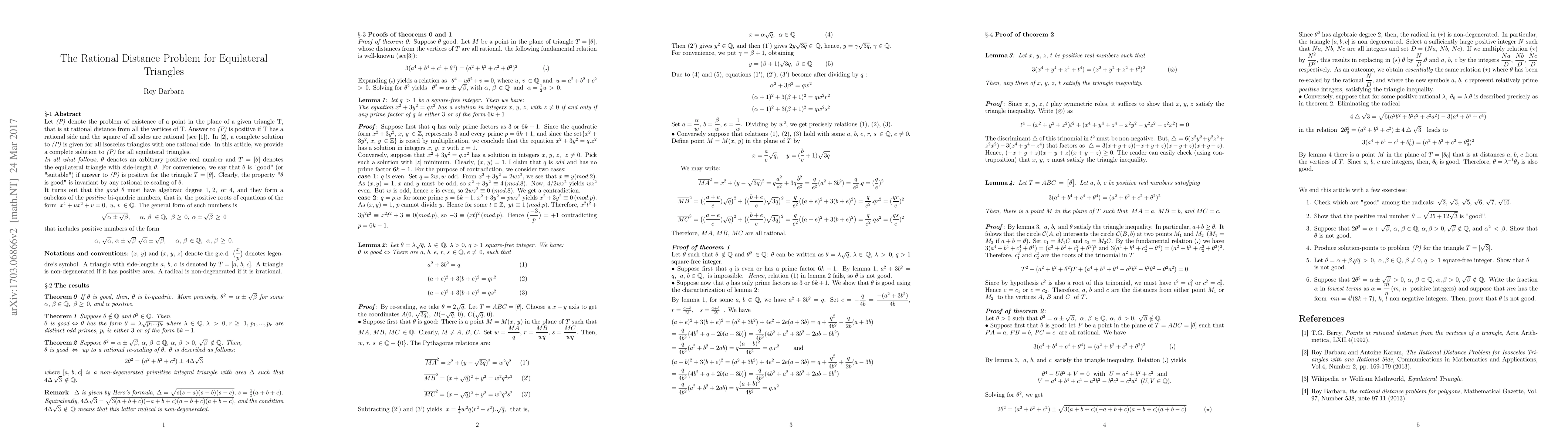 Summary: This paper resolves the Rational Distance Problem for equilateral triangles, proving the existence of a point in the plane of any given equilateral triangle that maintains rational distances from all three vertices.