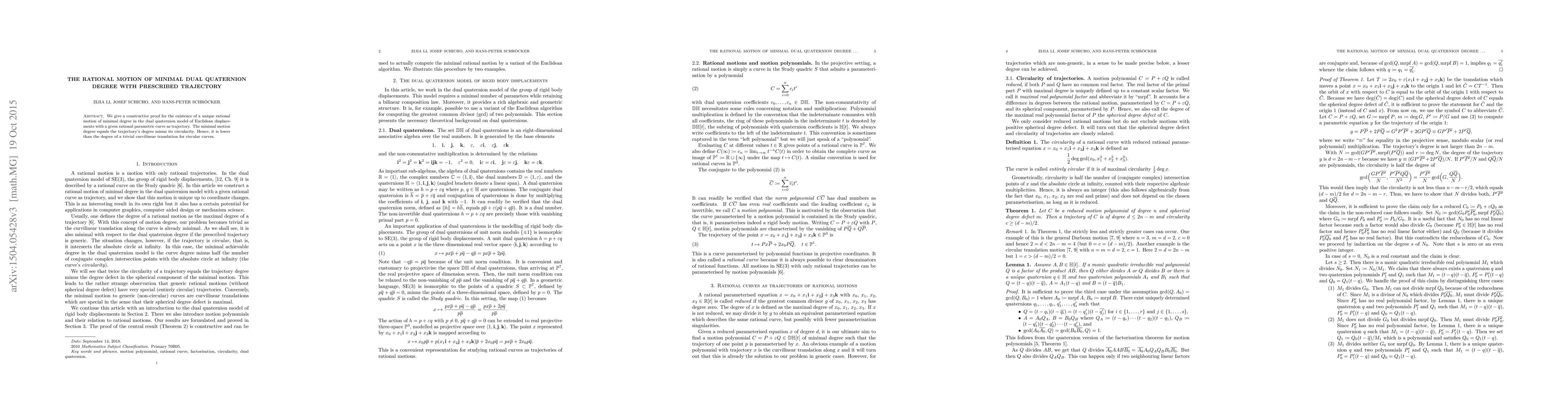 Summary: This paper presents a constructive proof for a unique rational motion of minimal degree in the dual quaternion model, ensuring a given rational trajectory. The minimal motion degree is determined by the trajectory's degree minus its circularity, which is lower than the degree of a trivial curvilinear translation for circular curves.