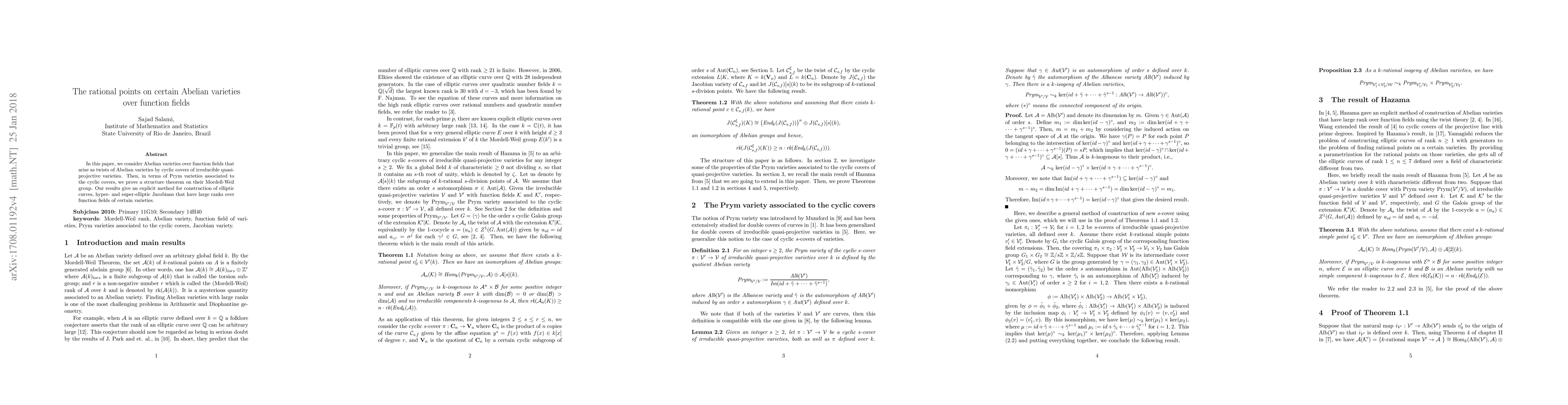 The paper investigates Abelian varieties over function fields, specifically twists of Abelian varieties by cyclic covers of irreducible quasi-projective varieties. It utilizes Prym varieties associated with the cyclic covers to prove a structure theorem on the Mordell-Weil group, providing an explicit method for constructing elliptic curves, hyper- and super-elliptic Jacobians with large ranks over function fields of certain varieties.