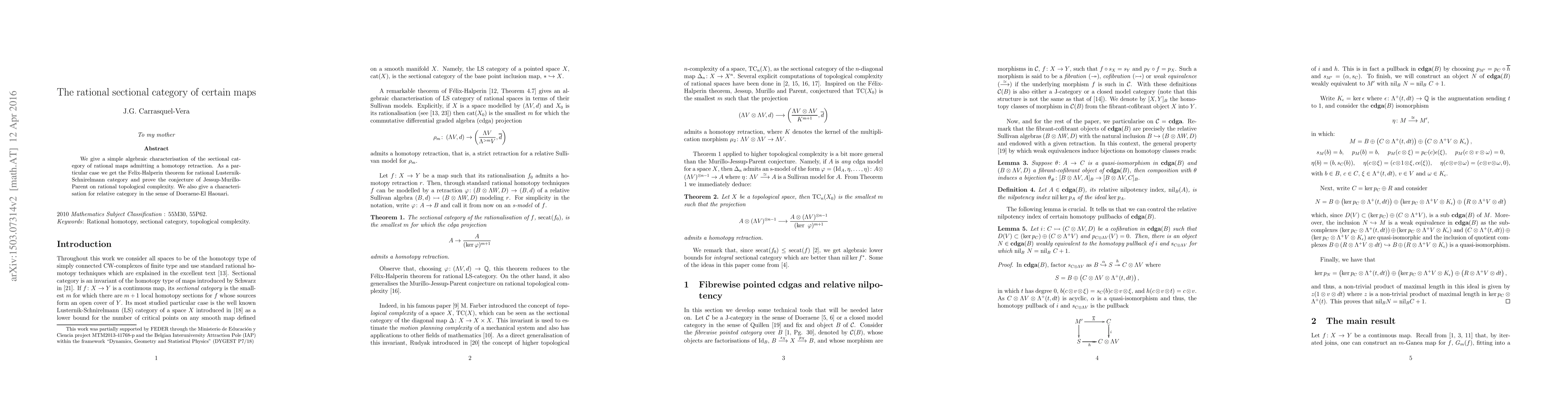 This paper provides an algebraic characterization of the sectional category for rational maps with homotopy retractions, extending the Félix-Halperin theorem and proving the Jessup-Murillo-Parent conjecture on rational topological complexity. It also characterizes relative category in the sense of Doeraene-El Haouari.