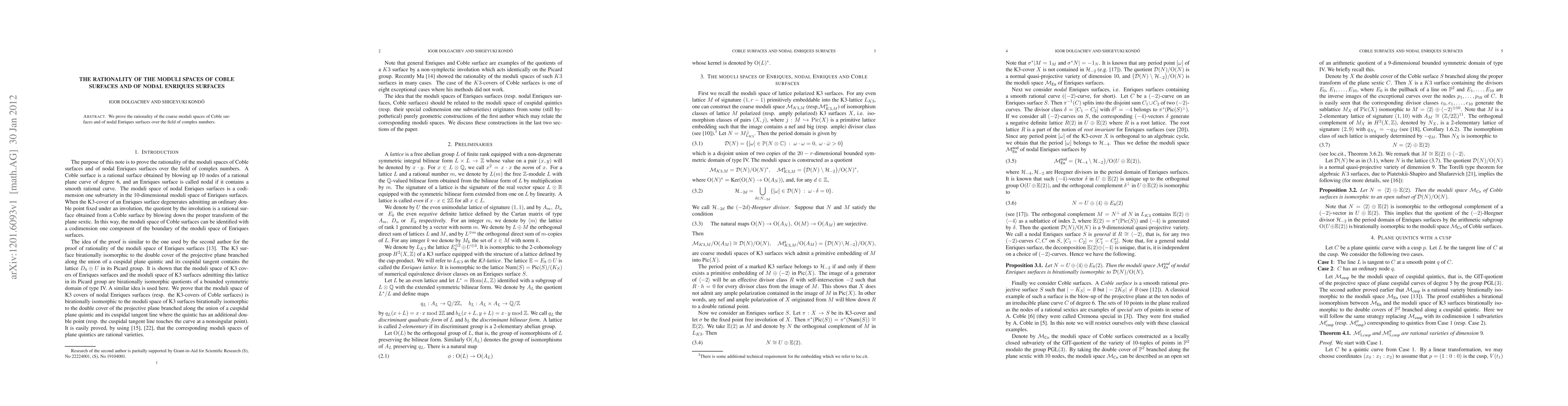 Summary: This paper proves the rationality of the coarse moduli spaces for Coble surfaces and nodal Enriques surfaces over the field of complex numbers. The findings contribute to the understanding of these algebraic surfaces' geometric properties.