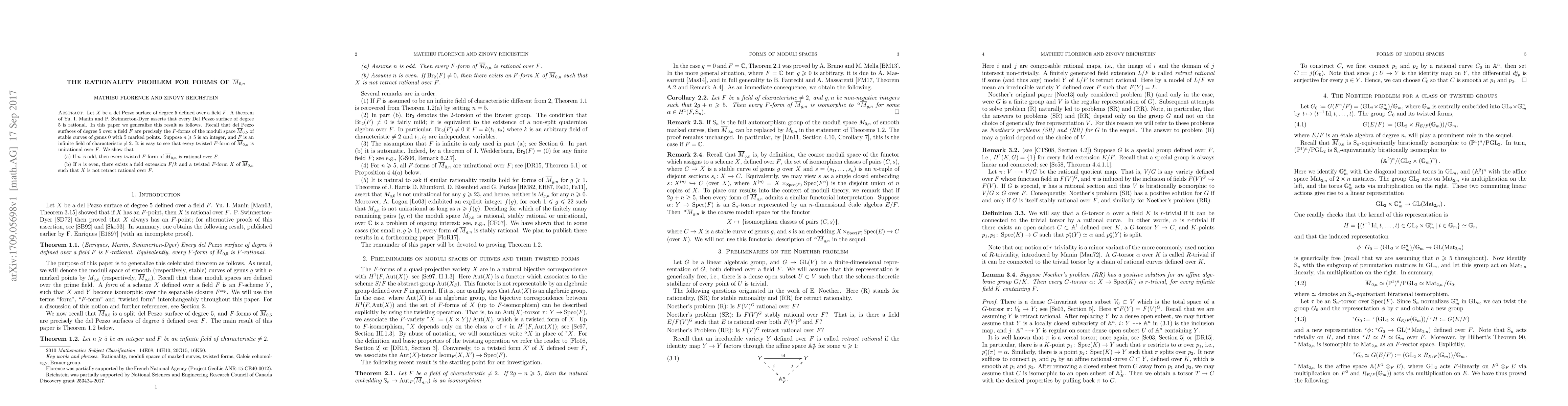 Let $X$ be a del Pezzo surface of degree $5$ defined over a field $F$. A theorem of Yu. I. Manin and P. Swinnerton-Dyer asserts that every Del Pezzo surface of degree $5$ is rational. In this paper we generalize this result as follows. Recall that del Pezzo surfaces of degree $5$ over a field $F$ are precisely the twisted $F$-forms of the moduli space $\overline{M_{0, 5}}$ of stable curves of genus $0$ with $5$ marked points. Suppose $n \geq 5$ is an integer, and $F$ is an infinite field of characteristic $\neq 2$. It is easy to see that every twisted $F$-form of $\overline{M_{0, n}}$ is unirational over $F$. We show that (a) if $n$ is odd, then every twisted $F$-form of $\overline{M_{0, n}}$ is rational over $F$. (b) If $n$ is even, there exists a field extension $F/k$ and a twisted $F$-form $X$ of $\overline{M_{0, n}}$ such that $X$ is not retract rational over $F$.