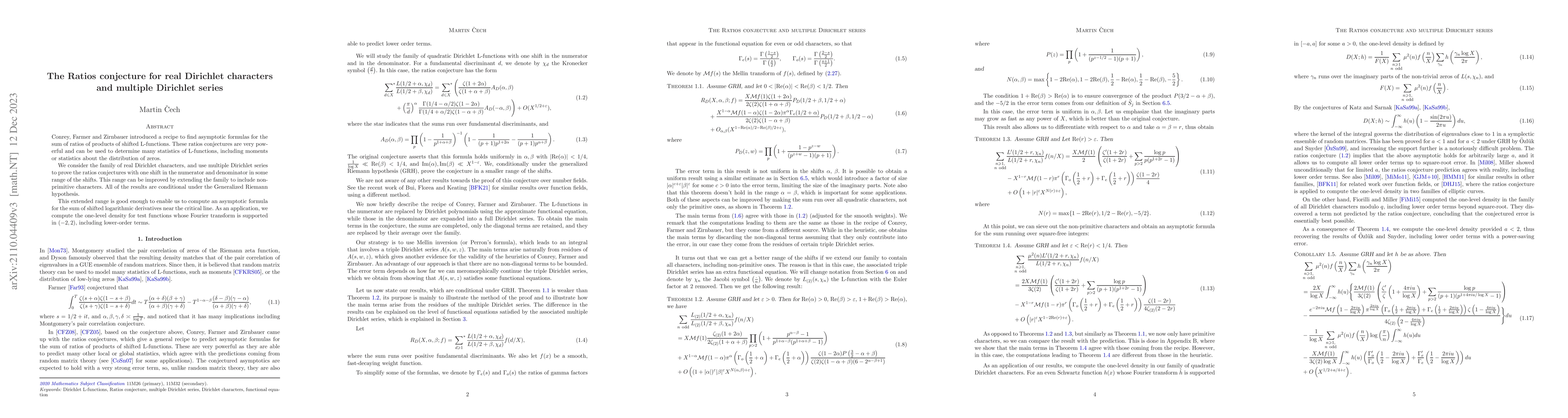 Summary: The paper proves the Ratios conjecture for real Dirichlet characters using multiple Dirichlet series, improving the range of shifts under the Generalized Riemann Hypothesis, and deriving an asymptotic formula for the sum of shifted logarithmic derivatives.