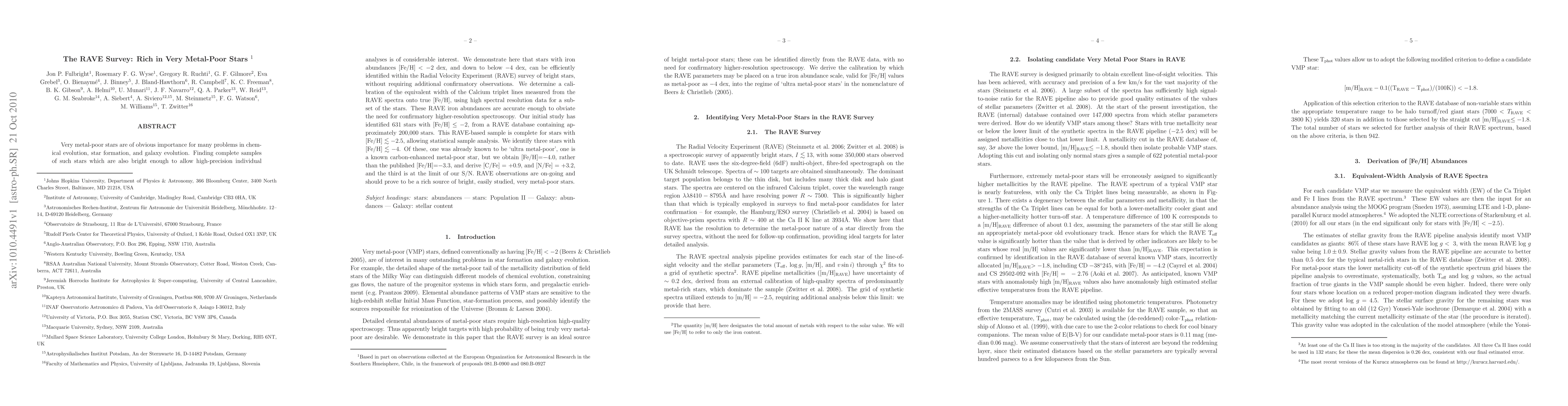 The RAVE Survey identifies very metal-poor stars ([Fe/H] < -2) efficiently, with 631 stars found from a database of 200,000 stars, and a calibration method for accurate iron abundances using Calcium triplet lines, obviating the need for higher-resolution spectroscopy. The survey is complete for stars with [Fe/H] < -2.5, including three ultra metal-poor stars.