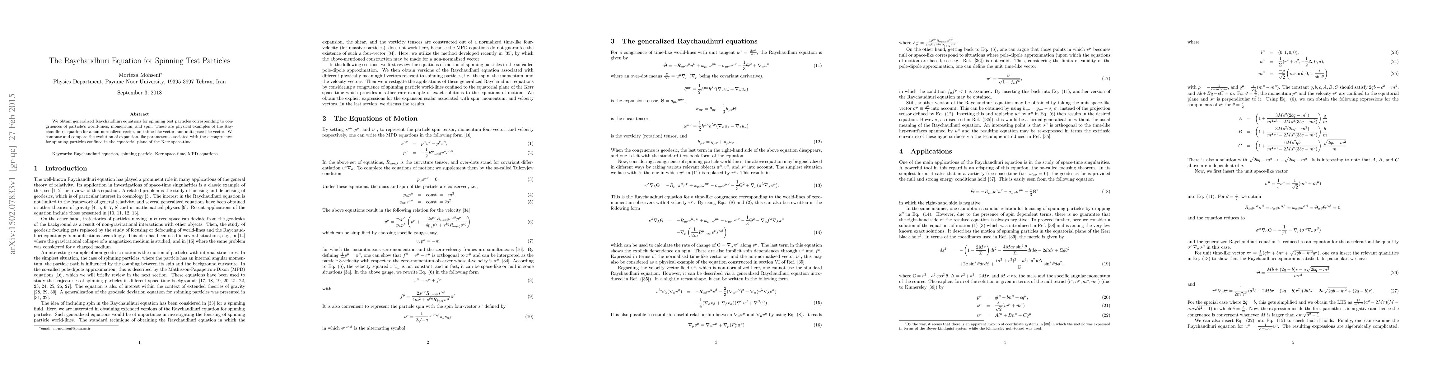 This paper generalizes the Raychaudhuri equation for spinning test particles, deriving equations for congruences of particle world-lines, momentum, and spin. It examines the evolution of expansion parameters for spinning particles in the Kerr space-time's equatorial plane.
