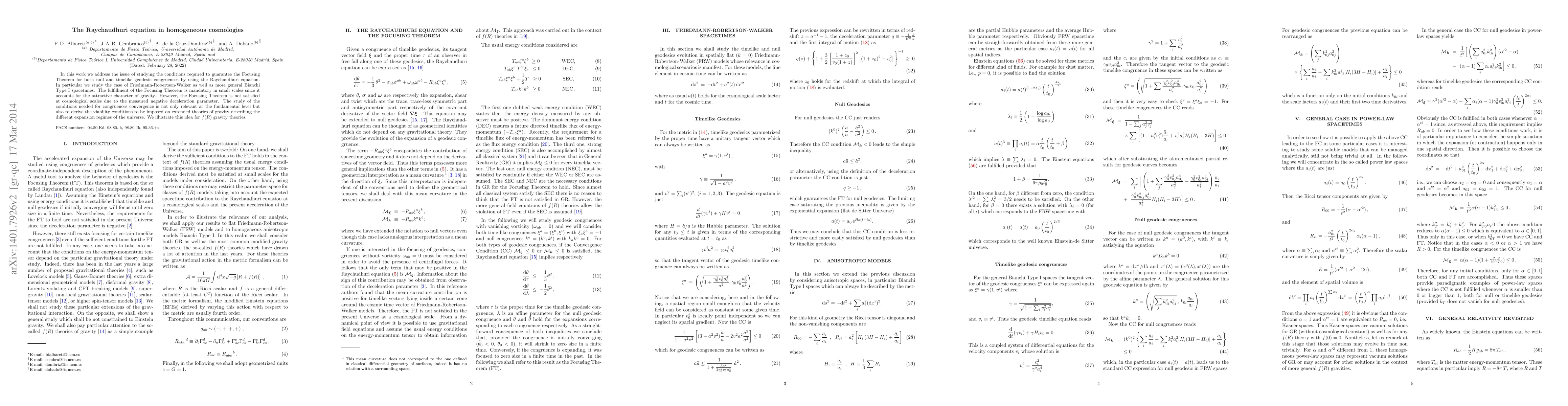 In this work we address the issue of studying the conditions required to guarantee the Focusing Theorem for both null and timelike geodesic congruences by using the Raychaudhuri equation. In particular we study the case of Friedmann-Robertson-Walker as well as more general Bianchi Type I spacetimes. The fulfillment of the Focusing Theorem is mandatory in small scales since it accounts for the attractive character of gravity. However, the Focusing Theorem is not satisfied at cosmological scales due to the measured negative deceleration parameter. The study of the conditions needed for congruences convergence is not only relevant at the fundamental level but also to derive the viability conditions to be imposed on extended theories of gravity describing the different expansion regimes of the universe. We illustrate this idea for f(R) gravity theories.