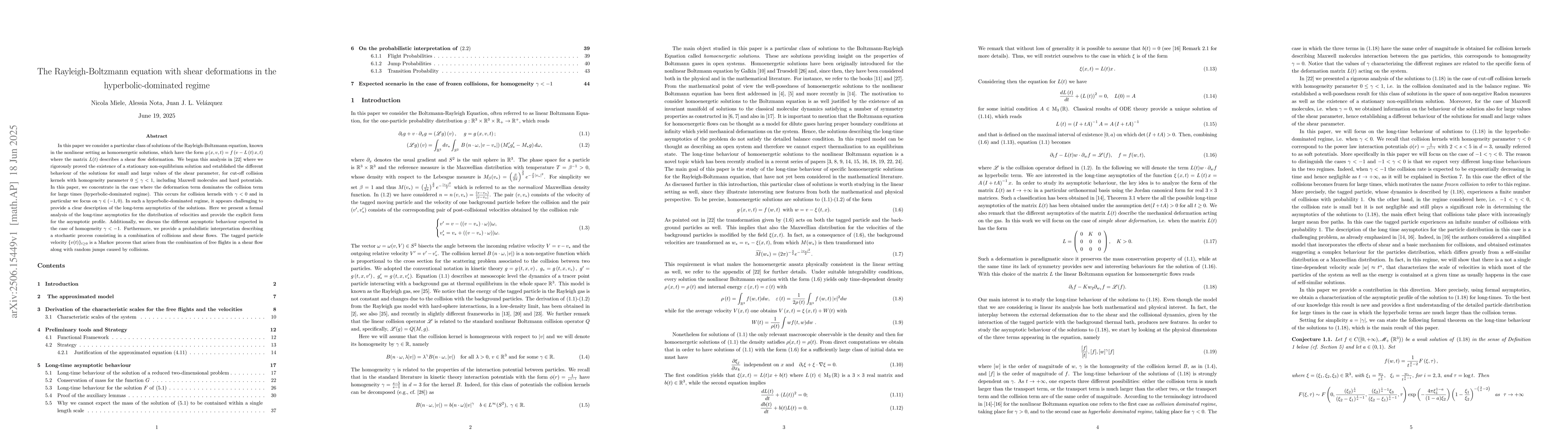 In this paper we consider a particular class of solutions of the Rayleigh-Boltzmann equation, known in the nonlinear setting as homoenergetic solutions, which have the form $g\left( x,v,t \right) =f\left( v-L\left( t\right)x,t\right)$ where the matrix $L(t)$ describes a shear flow deformation. We began this analysis in [22] where we rigorously proved the existence of a stationary non-equilibrium solution and established the different behaviour of the solutions for small and large values of the shear parameter, for cut-off collision kernels with homogeneity parameter $0\leq \gamma <1$, including Maxwell molecules and hard potentials. In this paper, we concentrate in the case where the deformation term dominates the collision term for large times (hyperbolic-dominated regime). This occurs for collision kernels with $\gamma < 0$ and in particular we focus on $\gamma \in (-1,0)$. In such a hyperbolic-dominated regime, it appears challenging to provide a clear description of the long-term asymptotics of the solutions. Here we present a formal analysis of the long-time asymptotics for the distribution of velocities and provide the explicit form for the asymptotic profile. Additionally, we discuss the different asymptotic behaviour expected in the case of homogeneity $\gamma < -1$. Furthermore, we provide a probabilistic interpretation describing a stochastic process consisting in a combination of collisions and shear flows. The tagged particle velocity $\{v(t)\}_{t\geq 0}$ is a Markov process that arises from the combination of free flights in a shear flow along with random jumps caused by collisions.