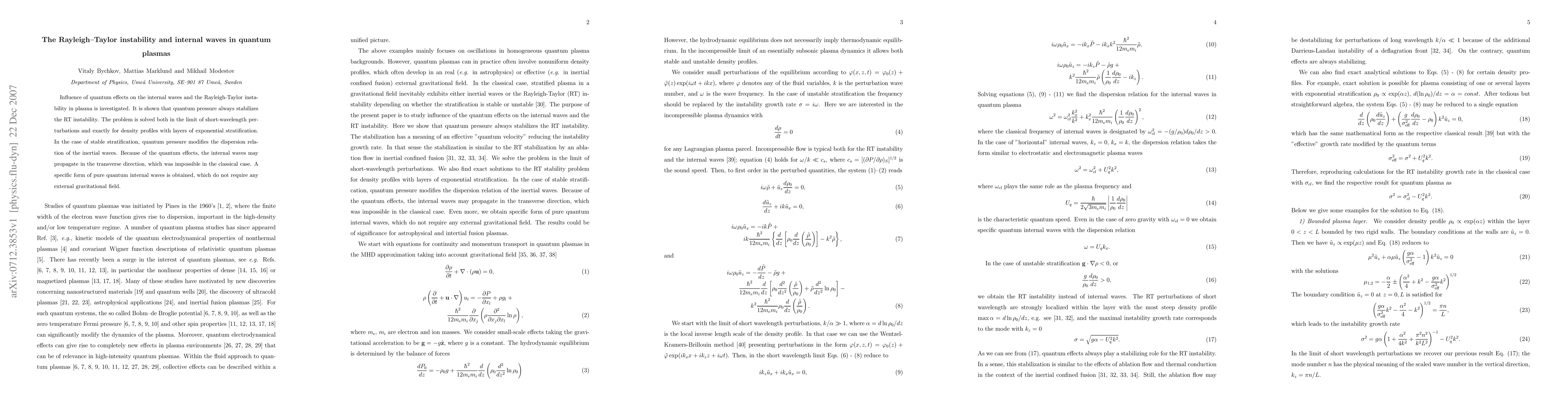 This paper investigates quantum effects on internal waves and the Rayleigh-Taylor instability in plasmas, demonstrating that quantum pressure stabilizes the Rayleigh-Taylor instability. Quantum pressure also modifies the dispersion relation of inertial waves and enables the propagation of quantum internal waves in the transverse direction, independent of external gravitational fields.