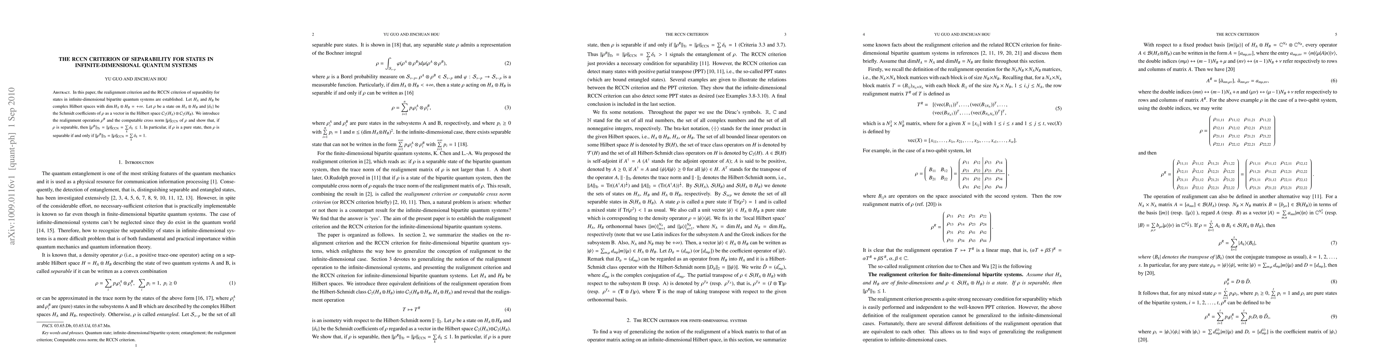 In this paper, the realignment criterion and the RCCN criterion of separability for states in infinite-dimensional bipartite quantum systems are established. Let $H_A$ and $H_B$ be complex Hilbert spaces with $\dim H_A\otimes H_B=+\infty$. Let $\rho$ be a state on $H_A\otimes H_B$ and $\{\delta_k\}$ be the Schmidt coefficients of $\rho$ as a vector in the Hilbert space ${\mathcal C}_2(H_A)\otimes{\mathcal C}_2(H_B)$. We introduce the realignment operation $\rho^R$ and the computable cross norm $\|\rho\|_{\rm CCN}$ of $\rho$ and show that, if $\rho$ is separable, then $\|\rho^{R}\|_{\rm Tr}=\|\rho\|_{\rm CCN}=\sum\limits_k\delta_k\leq1.$ In particular, if $\rho$ is a pure state, then $\rho$ is separable if and only if $\|\rho^{R}\|_{\rm Tr}=\|\rho\|_{\rm CCN}=\sum\limits_k\delta_k=1$.