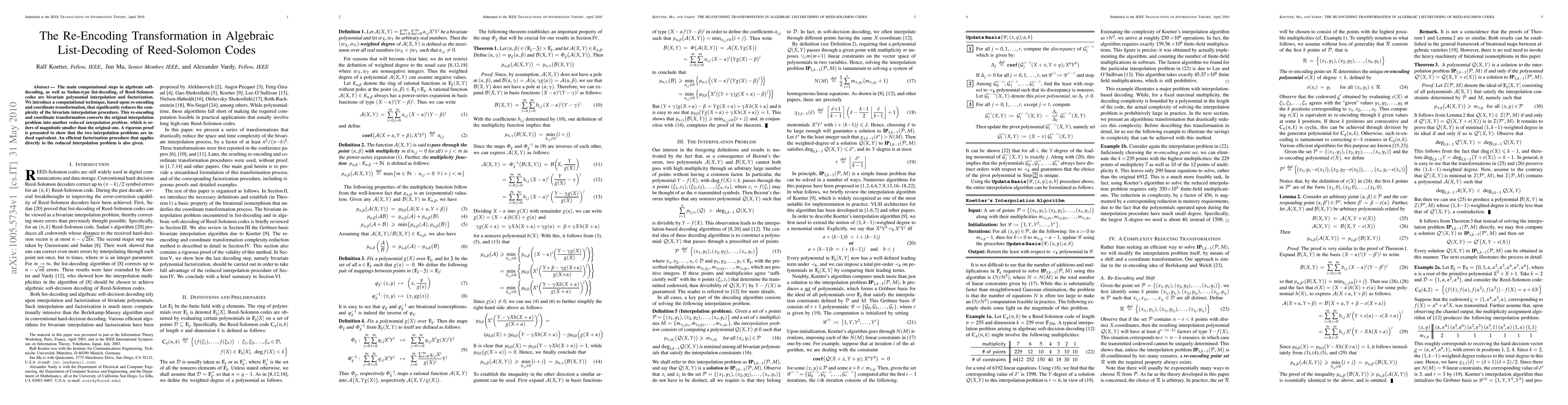 Researchers introduce a technique to simplify algebraic soft-decoding of Reed-Solomon codes by re-encoding and transforming the problem into a smaller, equivalent interpolation issue.