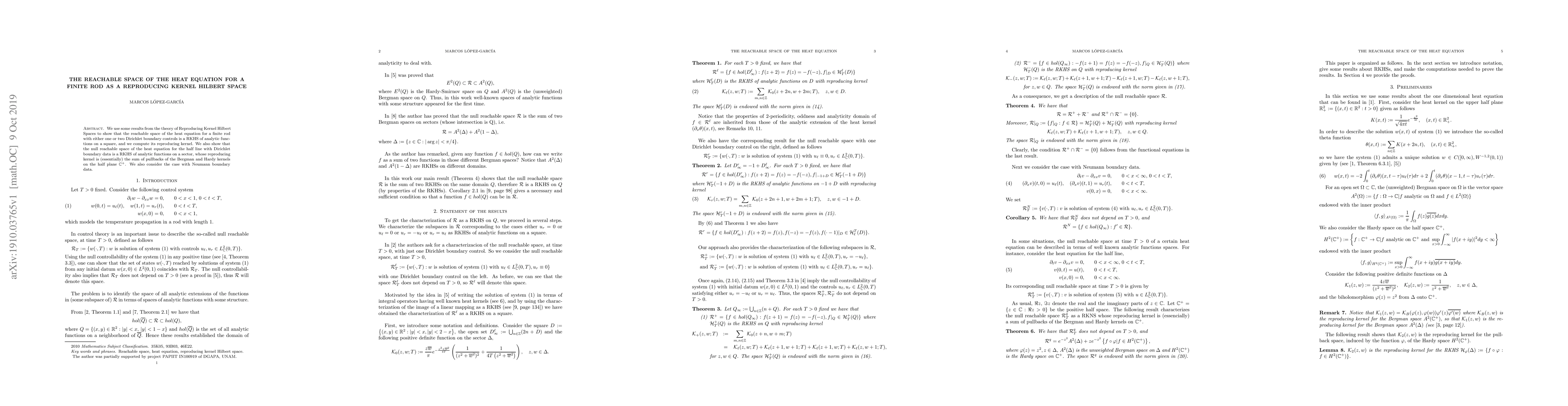 We use some results from the theory of Reproducing Kernel Hilbert Spaces to show that the reachable space of the heat equation for a finite rod with either one or two Dirichlet boundary controls is a RKHS of analytic functions on a square, and we compute its reproducing kernel. We also show that the null reachable space of the heat equation for the half line with Dirichlet boundary data is a RKHS of analytic functions on a sector, whose reproducing kernel is (essentially) the sum of pullbacks of the Bergman and Hardy kernels on the half plane $\mathbb{C}^+$. We also consider the case with Neumann boundary data.