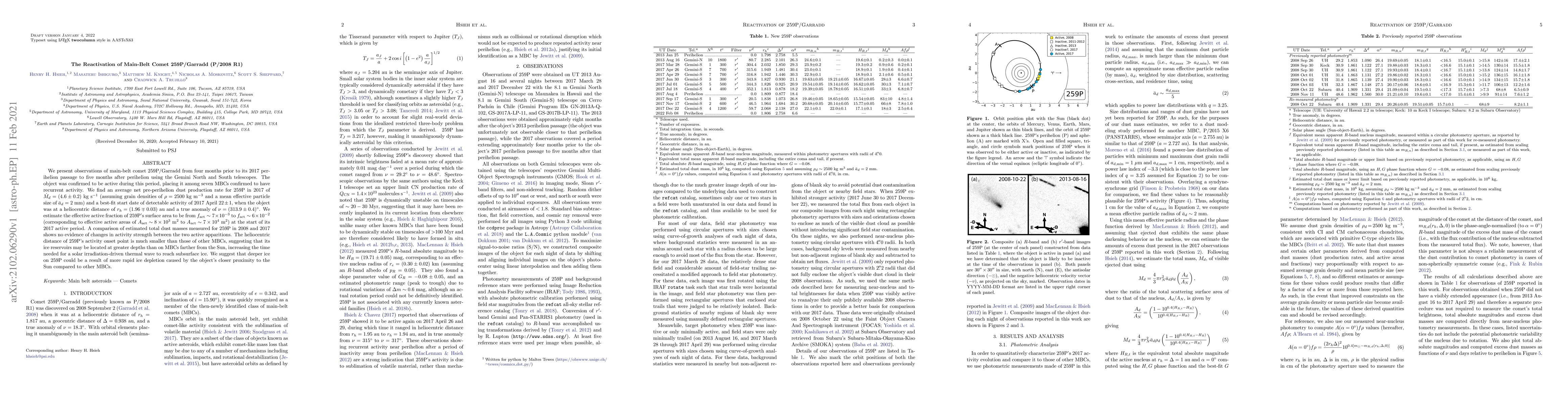 This study observes the reactivation of main-belt comet 259P/Garradd leading up to and following its 2017 perihelion, confirming its recurrent activity and estimating a dust production rate of 4.6±0.2 kg/s. The analysis suggests deeper ice reservoirs on 259P due to its closer proximity to the Sun compared to other main-belt comets.