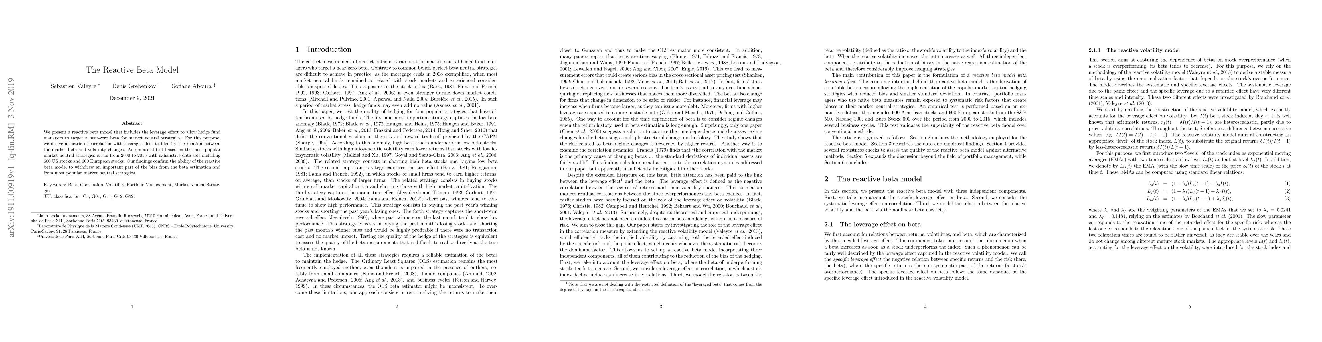 We present a reactive beta model that includes the leverage effect to allow hedge fund managers to target a near-zero beta for market neutral strategies. For this purpose, we derive a metric of correlation with leverage effect to identify the relation between the market beta and volatility changes. An empirical test based on the most popular market neutral strategies is run from 2000 to 2015 with exhaustive data sets including 600 US stocks and 600 European stocks. Our findings confirm the ability of the reactive beta model to withdraw an important part of the bias from the beta estimation and from most popular market neutral strategies.