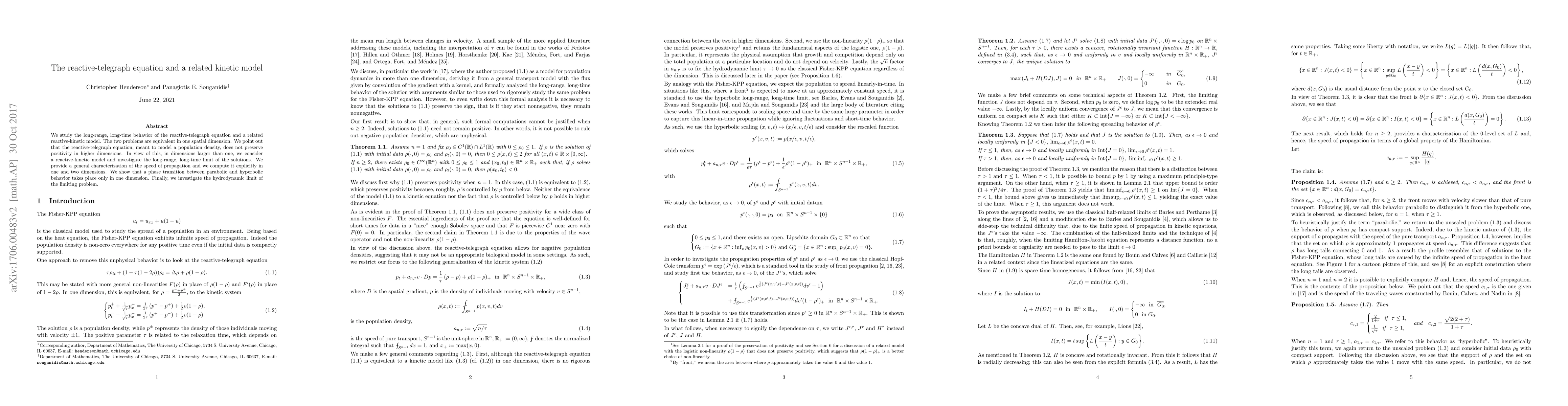 Researchers study long-range behavior of reactive-telegraph equation and related kinetic model, finding a phase transition between parabolic and hyperbolic behavior in one dimension.