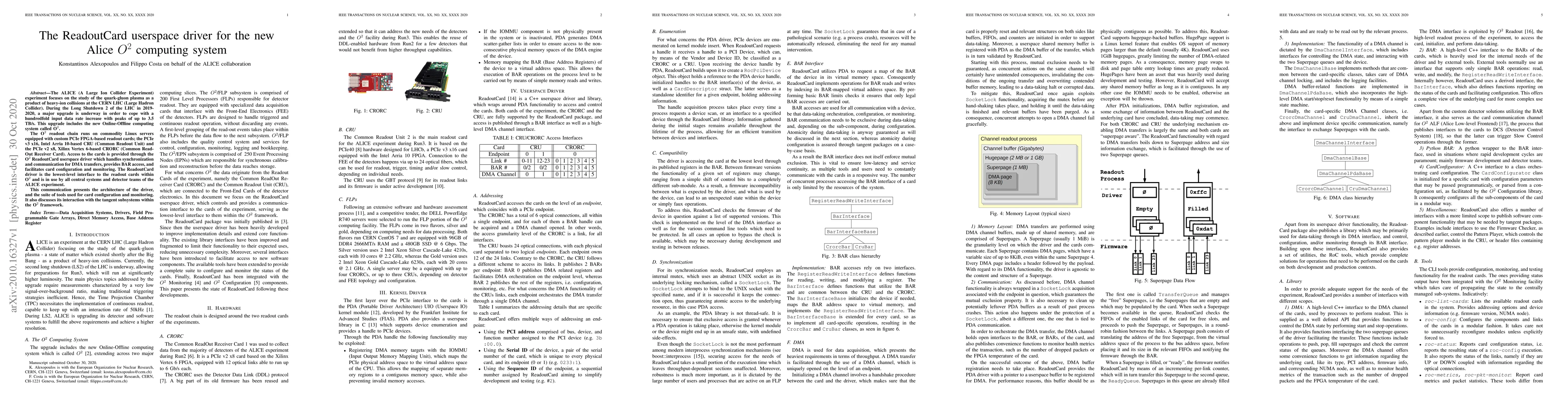 The ALICE experiment's O2 computing system upgrade includes a new ReadoutCard userspace driver for PCIe-based readout cards, facilitating synchronization, DMA transfers, and configuration. The driver is essential for handling the increased data rates and integrates with the O2 framework for efficient data readout.