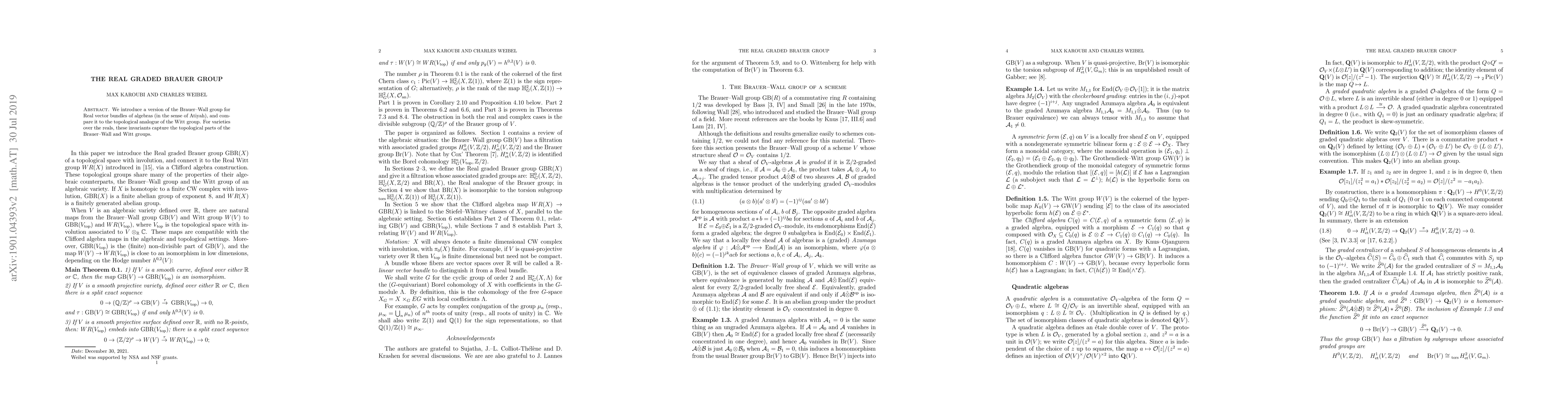 The research introduces a version of the Brauer-Wall group for Real vector bundles of algebras, comparing it to the topological analogue of the Witt group. It establishes a commutative diagram involving Br(V), GB(V), Q2(V), and BR(Vtop), demonstrating their relationships for varieties over the reals.