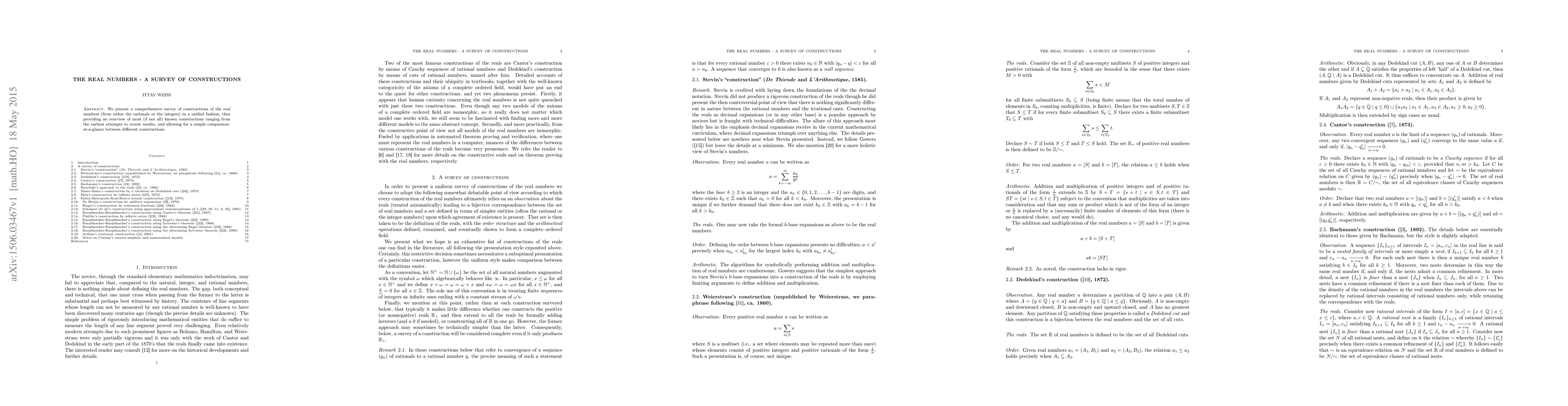 This paper provides a comprehensive survey of various constructions of real numbers, allowing for comparison between different methods. It offers an overview of most known constructions, from early attempts to recent results.