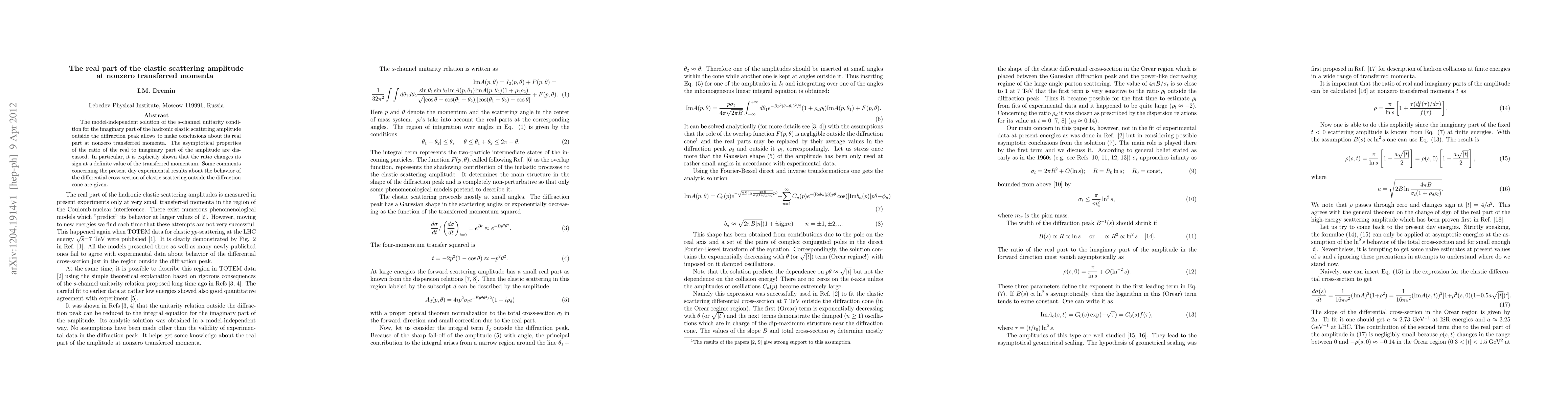 This paper presents a model-independent solution for the real part of the elastic scattering amplitude at nonzero transferred momenta using the s-channel unitarity condition for the imaginary part. It discusses the asymptotic behavior of the ratio of the real to imaginary parts and shows that this ratio changes sign at a specific transferred momentum value.