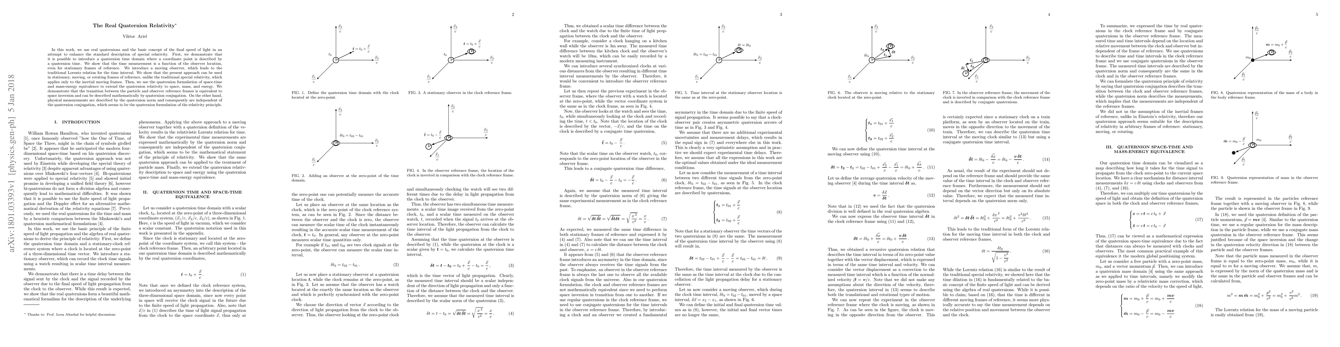 In this work, we use real quaternions and the basic concept of the final speed of light in an attempt to enhance the standard description of special relativity. First, we demonstrate that it is possible to introduce a quaternion time domain where a coordinate point is described by a quaternion time. We show that the time measurement is a function of the observer location, even for stationary frames of reference. We introduce a moving observer, which leads to the traditional Lorentz relation for the time interval. We show that the present approach can be used in stationary, moving, or rotating frames of reference, unlike the traditional special relativity, which applies only to the inertial moving frames. Then, we use the quaternion formulation of space-time and mass-energy equivalence to extend the quaternion relativity to space, mass, and energy. We demonstrate that the transition between the particle and observer reference frames is equivalent to space inversion and can be described mathematically by quaternion conjugation. On the other hand, physical measurements are described by the quaternion norm and consequently are independent of the conjugation, which seems to be the quaternion formulation of the relativity principle.