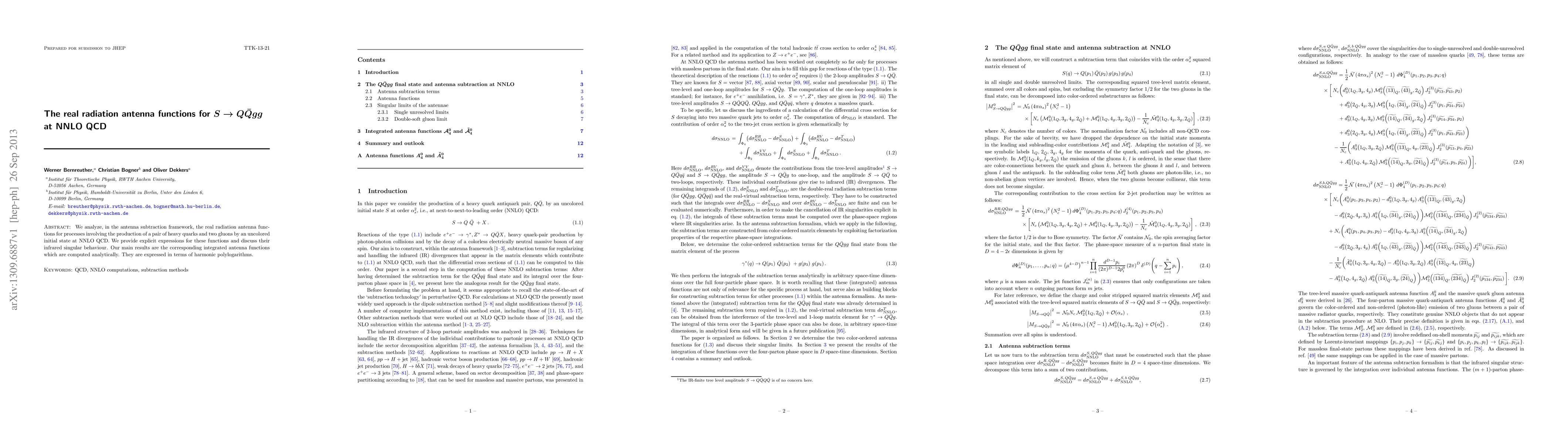 This paper analyzes the real radiation antenna functions for the production of a pair of heavy quarks and two gluons at NNLO QCD, providing explicit expressions and discussing their infrared singularities. The main results are integrated antenna functions computed analytically and expressed in terms of harmonic polylogarithms.