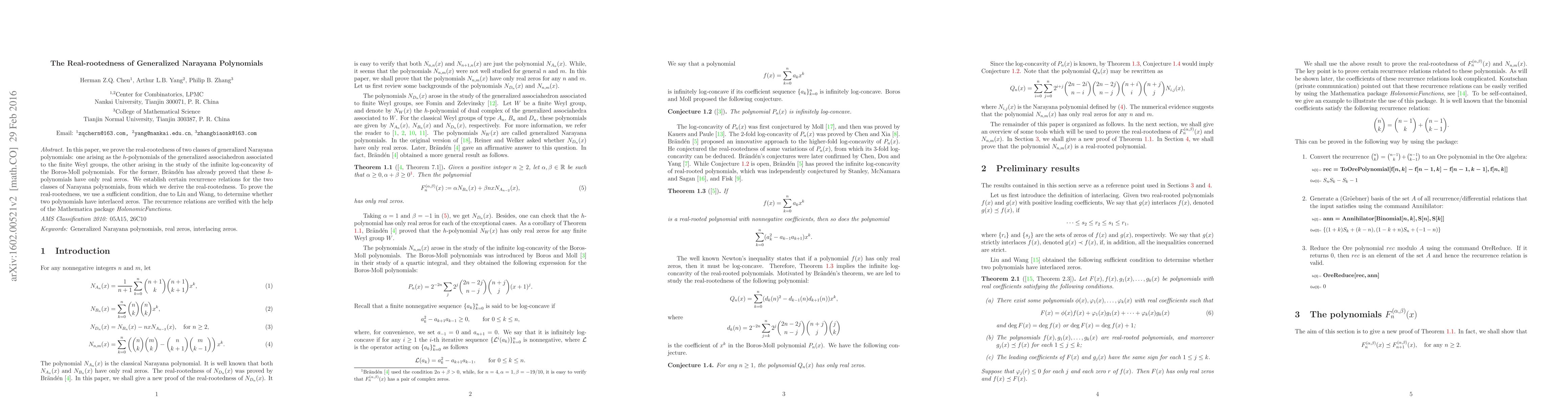 In this paper, we prove the real-rootedness of two classes of generalized Narayana polynomials: one arising as the $h$-polynomials of the generalized associahedron associated to the finite Weyl groups, the other arising in the study of the infinite log-concavity of the Boros-Moll polynomials. For the former, Br\"{a}nd\'{e}n has already proved that these $h$-polynomials have only real zeros. We establish certain recurrence relations for the two classes of Narayana polynomials, from which we derive the real-rootedness. To prove the real-rootedness, we use a sufficient condition, due to Liu and Wang, to determine whether two polynomials have interlaced zeros. The recurrence relations are verified with the help of the Mathematica package \textit{HolonomicFunctions}.