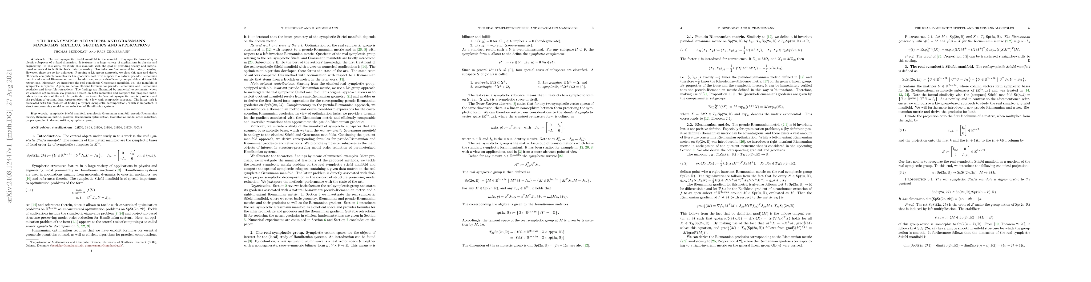 This paper studies the real symplectic Stiefel and Grassmann manifolds, deriving efficient formulas for geodesics and retractions under both pseudo-Riemannian and Riemannian metrics. The research applies these findings to numerical optimization and data processing tasks, including solving the 'nearest symplectic matrix' problem and optimal data representation via low-rank symplectic subspaces.