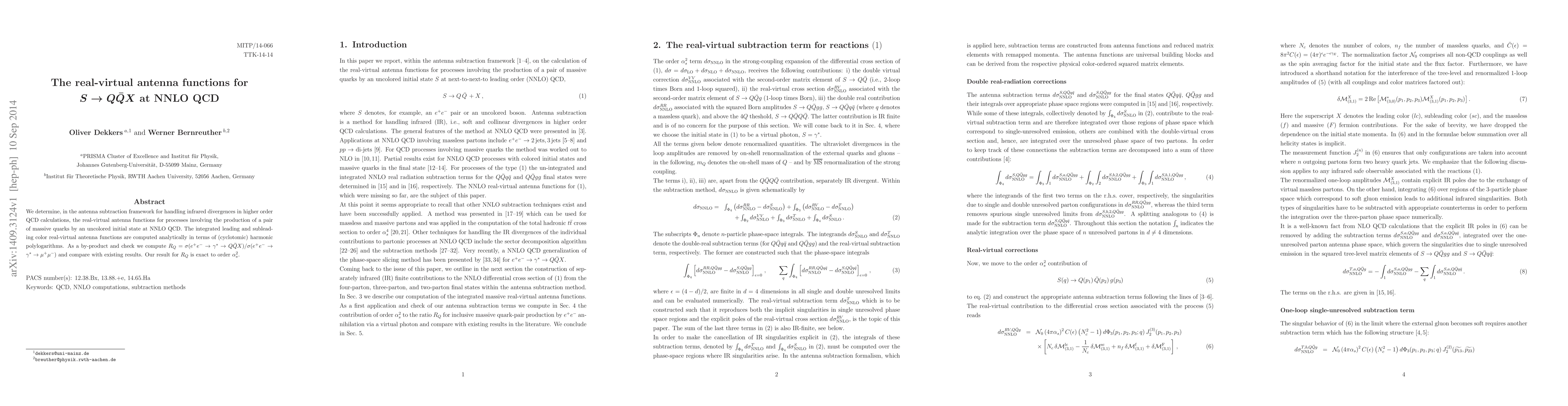We determine, in the antenna subtraction framework for handling infrared divergences in higher order QCD calculations, the real-virtual antenna functions for processes involving the production of a pair of massive quarks by an uncolored initial state at NNLO QCD. The integrated leading and subleading color real-virtual antenna functions are computed analytically in terms of (cyclotomic) harmonic polylogarithms. As a by-product and check we compute $R_Q=\sigma(e^+e^-\to \gamma^*\to Q\bar{Q}X)/\sigma(e^+e^-\to \gamma^*\to\mu^+\mu^-)$ and compare with existing results. Our result for $R_Q$ is exact to order $\alpha_s^2$.