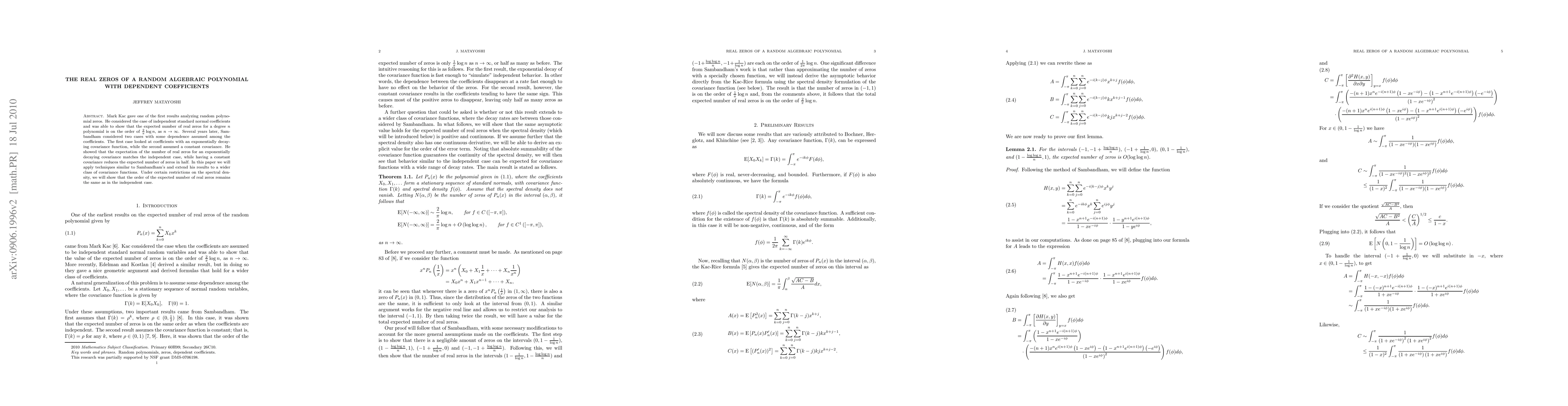 Mark Kac gave one of the first results analyzing random polynomial zeros. He considered the case of independent standard normal coefficients and was able to show that the expected number of real zeros for a degree n polynomial is on the order of (2/pi)log(n), as n goes to infinity. Several years later, Sambandham considered two cases with some dependence assumed among the coefficients. The first case looked at coefficients with an exponentially decaying covariance function, while the second assumed a constant covariance. He showed that the expectation of the number of real zeros for an exponentially decaying covariance matches the independent case, while having a constant covariance reduces the expected number of zeros in half. In this paper we will apply techniques similar to Sambandham's and extend his results to a wider class of covariance functions. Under certain restrictions on the spectral density, we will show that the order of the expected number of real zeros remains the same as in the independent case.