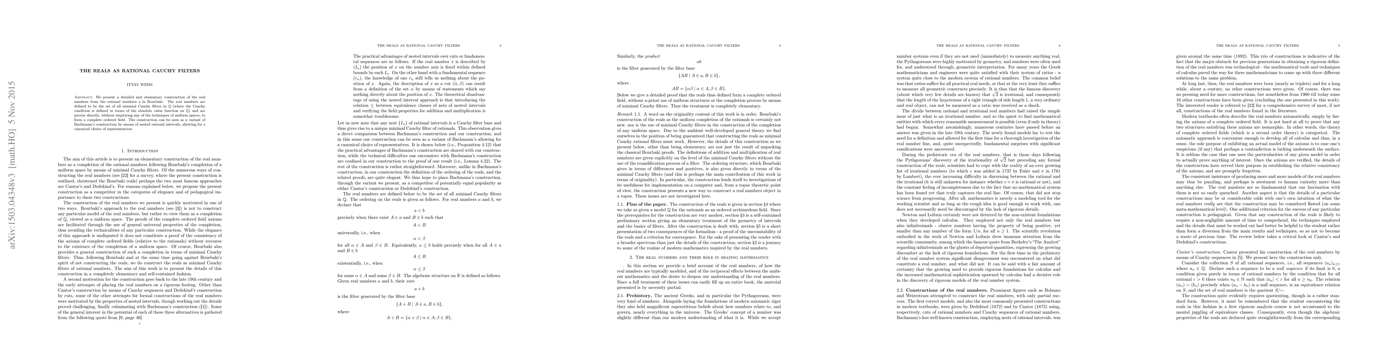 This paper constructs real numbers from rational numbers as minimal Cauchy filters, offering a complete ordered field without employing uniform spaces. It builds upon Bachmann's construction with a canonical choice of representatives.